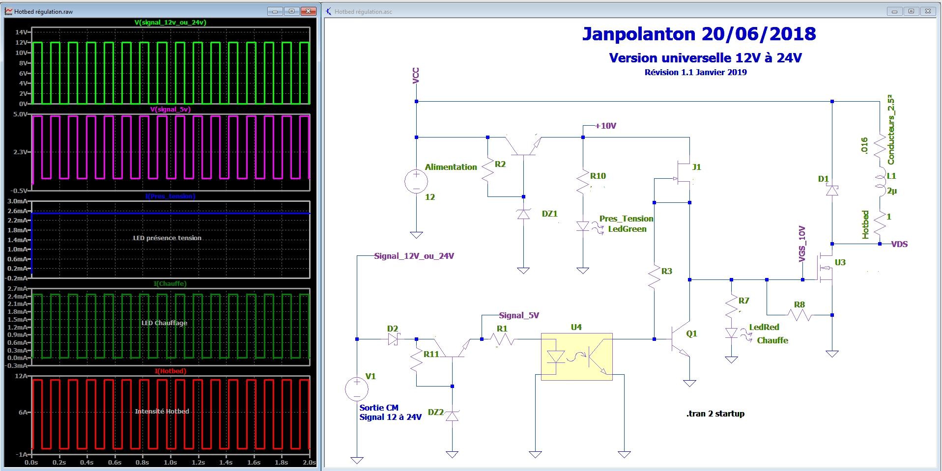 Janpolanton Posté(e) Janvier 15, 2019 Auteur Posté(e) Janvier 15, 2019 En ce début d'année, je lance ou reprends certains projets, dont celui-ci dont je viens de faire une usine à gaz mais qui devrait évoluer. Je mets ci-dessous 2 simulations de fonctionnement, d'une part sous 12V et d'autre part sous 24V. Si vous avez des questions sur ce schéma (sauf les valeurs des composants), n'hésitez pas A suivre...