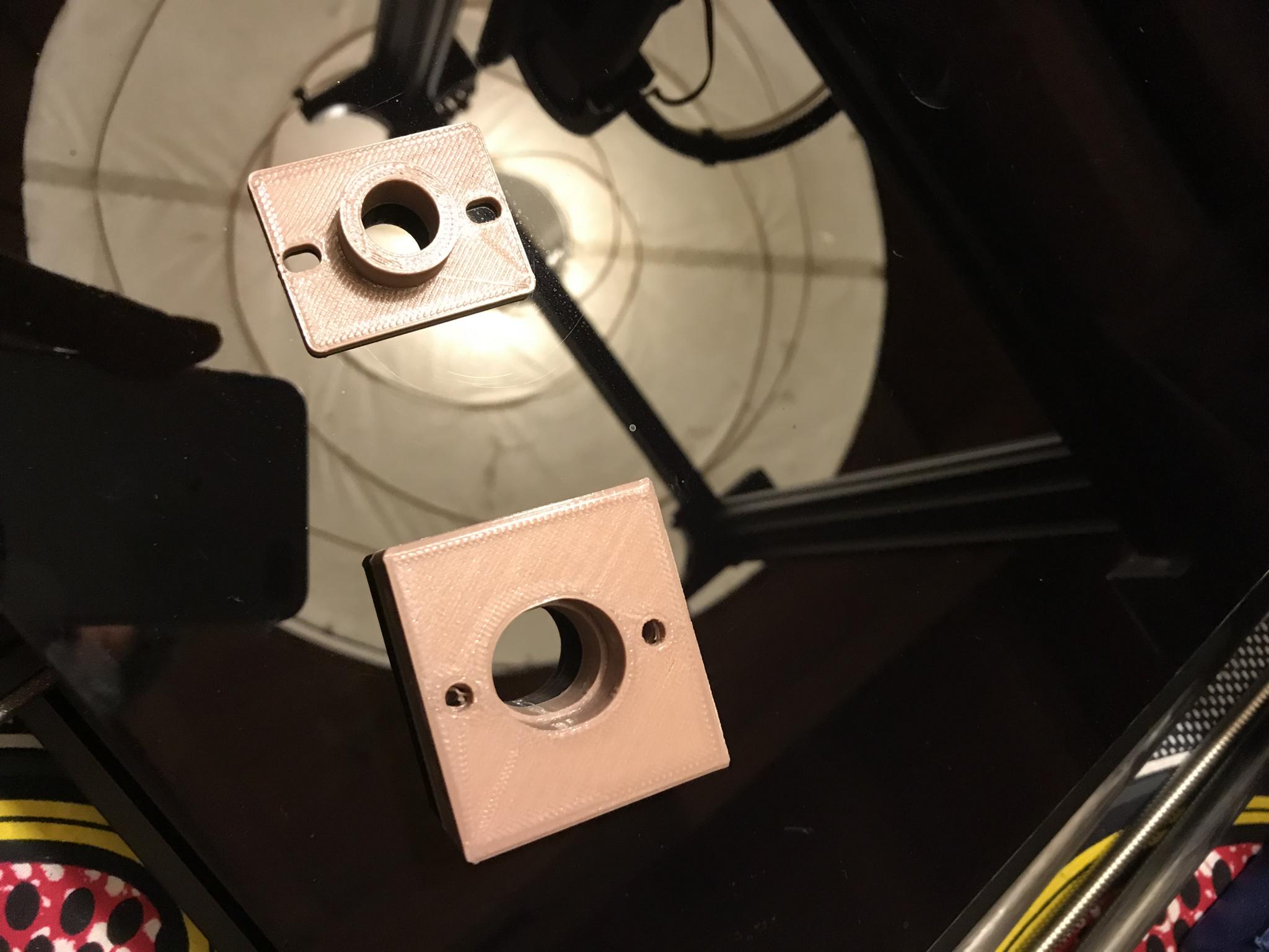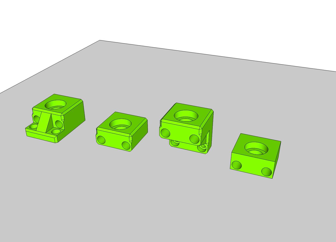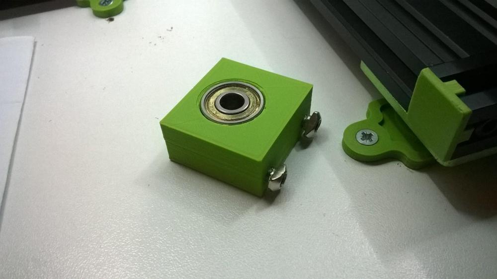 Artazole Posté(e) Novembre 1, 2018 Auteur Posté(e) Novembre 1, 2018 Alors suite de l'avancement : J'ai donc fait un support pour le roulement 608zz que je vais mettre en haut et en bas, pour guider la tige T8 en deux points. Voilà donc un premier jet pour vérifier les cotes et faire un rapide test. Sur le dessin, la plus a droite est la pièce de test, les 2 et 3 sont les mêmes mais une est plus costaud et possède 4 points d'ancrages plutôt que 2, une variante en somme. La 4 est la base. Reste une pièce a dessiner pour recevoir le pied de la tige et centrer sur le roulement. Et next, c'est la plaque. je fignole encore donc je ne colle pas les stl.