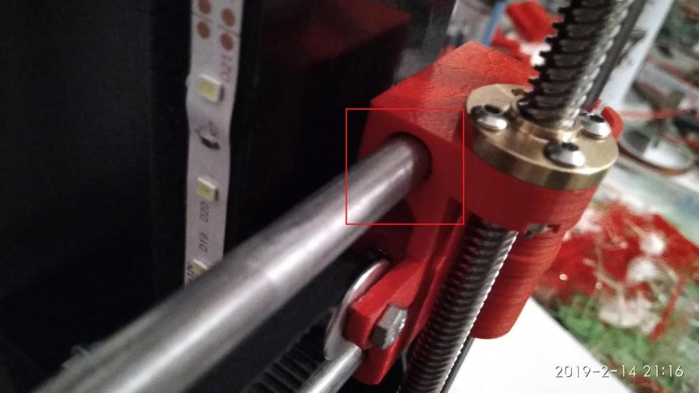 joyeufetar Posté(e) Février 17, 2019 Auteur Posté(e) Février 17, 2019 Bonsoir, Voila une photo du soucis (c'est plus simple qu'une explication ). C'est la partie entourée en rouge qui avait du jeu Du coup, j'ai réimprimé ces pièces la et ça a réglé ce soucis. Plus de jeux à ce niveau la. Pour le reste, ayant du jeu aux niveaux des nouveaux (faux) igus, j'ai tout redémonté, et j'ai monté des douilles à billes. Les douilles permettront de tester et de vérifier les soucis. Du coup, tous les axes sont maintenant en douilles à billes. Aucun point dur, aucun jeu au niveau des douilles, bref, ça semble bien. Mais ça n'a pas résolu le soucis... Les impressions sont toujours autant dégueulasses... Je ne pige plus rien Franchement, j'ai jamais eu de soucis comme ça. Avant j'avais une qualité parfaite et la, peu importe ce que je test, ça ne change jamais rien (ou en pire )... Du coup, ça me gave, je ne sais plus trop quoi faire/tester Peut être un soucis dans le firmware du coup ? Cordialement