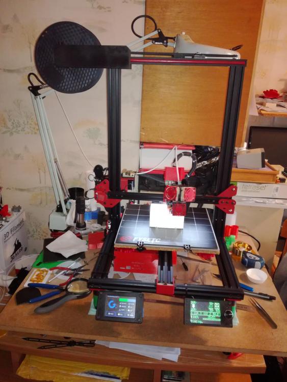 jojodroopy Posté(e) Octobre 13, 2019 Posté(e) Octobre 13, 2019 Le 03/10/2019 at 00:23, Titi78 a dit : Histoire de montrer quelque chose, voici a quoi devrait ressembler ma CR-10S dans quelques WE : Voici la liste des modifications réalisées en 1 an bientôt . j'ai modélisé ou modifié toutes les pièces excepté l'extrudeur alu en prenant l’inspiration du travail de Cornely_Cool (Merci au passage) sur thingiverse Système d'arrêt automatique Réglage de réglage des tensions courroies X et Y Extrudeur Alu Porte outils (clés alen pince spatule cuteur réglet etc...) Dévideur/Débobineur automatique de filament Refroidisseur de Hot-end canalisant l'air Grille ventilo Hot-end silencieuse Spot éclairage buse Chariot du Y allégé Cales de maintiens parallélisme de la courroie du X A faire : Renfort de structure Synchronisation des 2 moteur Z par courroie avec tendeur refroidissement buse par un ventilo radial Et je suis preneur d'idées Bonjour Titi78 Tu n'as pas eu envi de la passer en standalone, plus de boitier à part, plus de câble qui trainent... Je te joints une photo de ma bête sur laquelle je fait des modifs depuis janvier que je l'ai. J'en suis assez satisfait surtout depuis que grâce à toi je n'ai plus ce problème de retour X qui plante. Alors j'ai ajouté le Bltouch qui me permet surtout de changer de plateau sans refaire les réglages à chaque fois. Rehaussé les pieds afin de glisser dessous le boitier de carte mère et l'alim. Les deux afficheurs, un MKS 35 et un LCD qui sont complémentaires comme tu le sais sûrement. Le double axe Z est très efficace je n'ai plus les pièces un peu écrasées sur la droite surtout dans les premiers millimètres et j'en passe. Je pense que sur la photo tu vas pouvoir constater les modifs. D'ailleurs je te renvois la balle, si tu as des suggestions à me faire sur d'autres modifs. J'adore imprimer des pièces mais aussi et surtout les modifications et tests en tous genres... Ah j'oubliai...la carte mère est une MKS Gen L avec TMC2208 tête Aio Evo. J'envisage de monter une Bigtreetech SKR pro et de tenter la multi extrusion par la suite. Eh oui les retraités ont besoin de s'occuper surtout que j'ai toujours été très actif et je dois le rester... 2