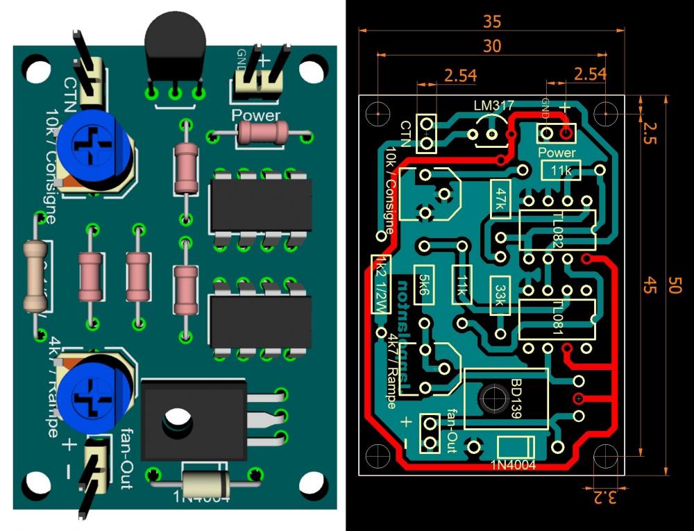 Janpolanton Posté(e) Février 24, 2019 Auteur Posté(e) Février 24, 2019 J'ai continué à bosser sur le schéma. Quand on regarde la courbe, bien que la tension soit à 0 tant qu'on a pas atteint le seuil de déclenchement, ensuite celle-ci monte progressivement sans pour autant que le ventilateur démarre. Mon idée, c'est de booster la tension à la température de démarrage à environ 8 V (éventuellement plus élevée si besoin) et ensuite de faire croitre cette tension progressivement par rapport à la température. Par contre, l'inconvénient, c'est que le schéma s'est un peu compliqué et qu'il sera moins simple de réaliser le circuit sans PCB. Donc, si il y a des demandes, je verrai pour faire graver un lot de PCB et les proposer à la vente.