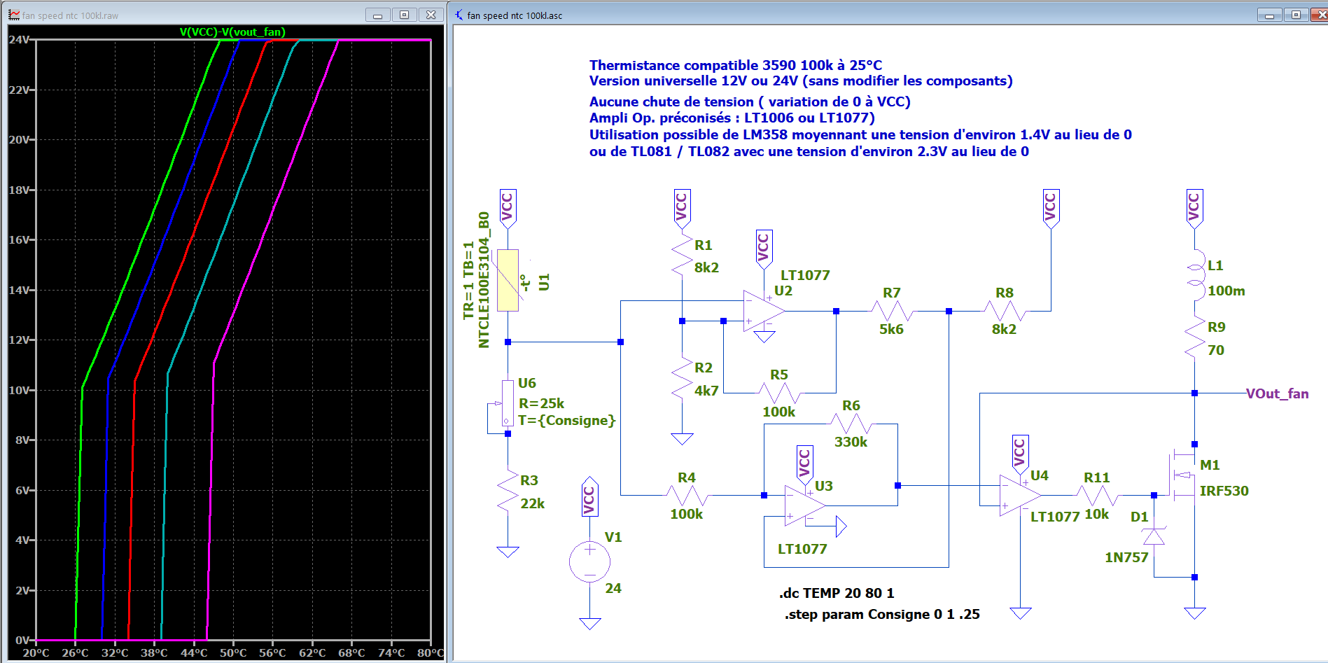 Janpolanton Posté(e) Février 28, 2019 Auteur Posté(e) Février 28, 2019 Bonjour à tous, J'ai de nouveau planché sur un schéma Ses points forts : Il est compatible avec les thermistances 3950 100k à 25°C utilisées sur la majorité de nos imprimantes. Il est universel 12V ou 24V sans modification Il atteint la tension d'alimentation maxi et descend à 0V Ses inconvénients (et oui, c'est pas simple d'avoir le beurre et l'argent du beur...) Pour atteindre les tension maxi et mini, il faut utiliser des ampli opérationnels bien spécifiques LT1006 ou LT1077 ou le variante en boitier double) Avec des ampli op. classiques, LM358 ou TL081/082, la tension mini plafonne au mieux à 1.4V et n'atteint pas le 0V (mais est-ce vraiment gênant?) Voici la simulation du fonctionnement de la version 24V et la simulation du fonctionnement de la version 12V 2
