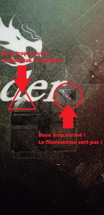 Bosco2509 Posté(e) Mai 17, 2019 Posté(e) Mai 17, 2019 Si tu me permet de reprendre ta photo : Pas besoin d'une loupe pour le voir... Ta buse est vraiment trop écrasé. Il me semble même que le buildtak se déchire à un endroit... sûrement une impression précédente. PS : a continuer ainsi... tu vas "flinguer" le buildtak... et accessoirement... flinguer la buse... et forcer l'extrudeur... qui doit "sans trop me tromper" doit commencer à ronger ton filament. Mais... au moins... c'est l'expérience qui rentre...