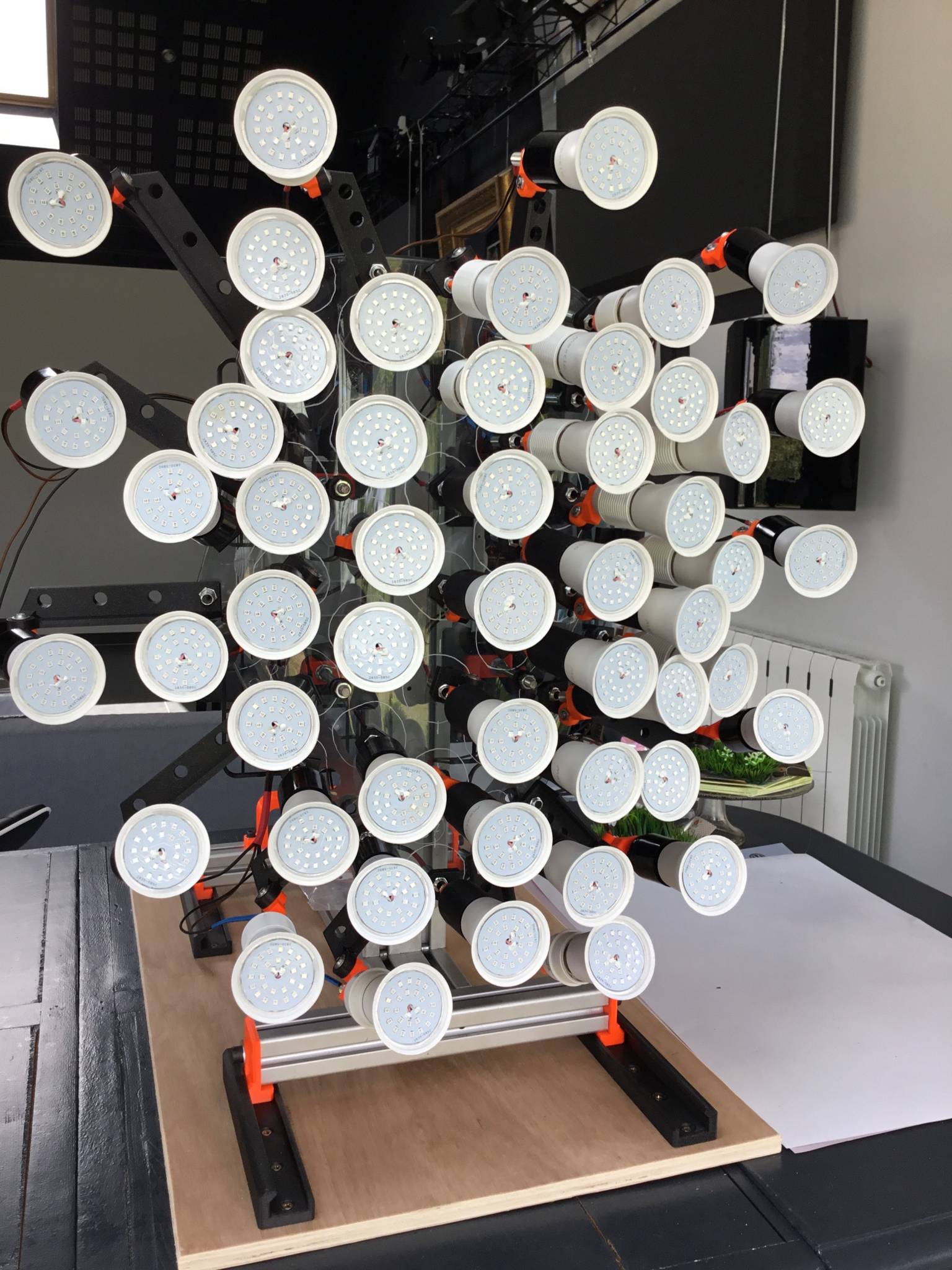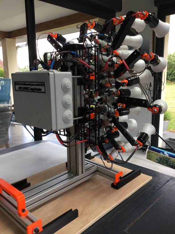 divers Posté(e) Juin 6, 2020 Posté(e) Juin 6, 2020 (modifié) Voici une partie de nom dernier dispositif de polymérisation instantané de grandes pièces vernies. Sur la photo c’est la moitié de la partie polymérisation mais avant il y a d’autres sous-ensembles en I.R. a quartz pour désolvanter. on ne le voit pas sur la photo mais les lampes ne sont pas sur le même plan car les pièces à traiter sont bombées. Il y a 50 lampes de 25 leds donc 1250 leds par face pour une puissance de 550W. je n’ai pas encore bien positionner les lampes car elles sont toutes réglables Indépendamment dans les trois directions (encore un peu de boulot) Modifié (le) Juin 6, 2020 par divers 1