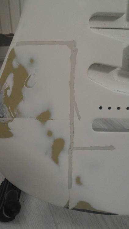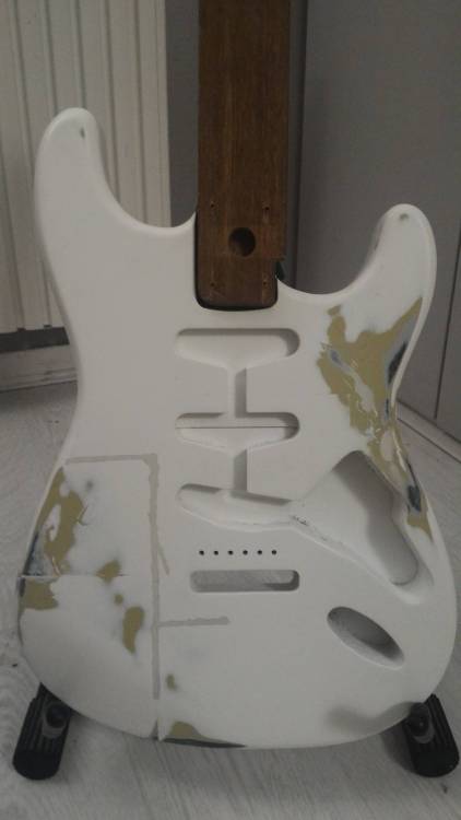En fait la guitare a été posé sur un support alors qu'elle n'était pas encore sèche ce qui a fait des sortes de rainures donc j'ai acheté du mastic (syntofer pour de la finition) mais il a réagit avec la peinture et donc ça a fait plein de dégâts (principalement des bulles d'air). Après oui il y a des petites fissures qui apparaissent sur la guitare car les pièces travaillent mais je ne sais pas comment les empêcher d'apparaître... Ensuite pour poncer le mastic de finition, comme il ne se ponçait vraiment pas bien j'ai prus du trop gros grain ce qui a causé encore plus de dégats...