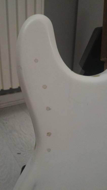Voici les photos de l'état actuel. Je mets du mastic polyester, je ponce et je remets direct 2-3 couches de peinture ? Je précise que la peinture se ponce extrement mal et que c'est extrement long donc je ne vais pas poncer toute la guitare pour enlever la peinture et la refaire entièrement 😞