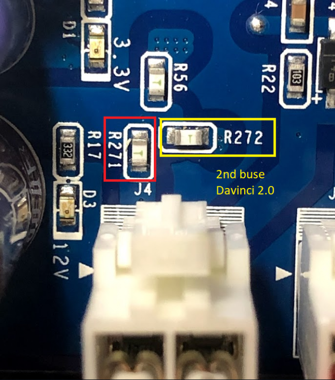 judroms Posté(e) Décembre 27, 2019 Auteur Posté(e) Décembre 27, 2019 (modifié) Suite et fin, j'ai trouvé la solution là (forum en anglais): http://www.soliforum.com/topic/12398/fuse-for-12-volt-extruder/ L'explication/tuto qui suit pourra servir à ceux qui ont le problème identique sur Davinci 1.0, 1.0A et 2.0 mais aussi à ceux qui veulent mettre un vrai fusible sur l'alimentation de la tête d'extrusion. Il s'agissait d'un fusible qui avait lâché. Dans le sujet, ils parlent d'abord de résistance faible, puis nulle et enfin de fusible car les résistance nulles sont noirs avec 000 dessus. Toujours est-il que ce fusible est soudé à la carte et qu'il s'agit d'un composant CMS (mini composants), donc très difficile à remplacer qd on n'a pas le matos adéquate. ATTENTION, la seconde photo est celle d'une carte pour Davinci 2.0 pour inclure ceux qui ont le pb sur la seconde buse de leur imprimante. Sur les davinci 1.0 et 1.0A, la R272 n'est pas présente. Pour tester si c'est la même cause de votre problème, il faut mesurer la résistance du composant R271 entouré en rouge sur la seconde photo. Si elle est égale à 0 ou très très faible, le problème vient d'ailleurs et ce n'est pas la peine de continuer à lire ceci. Si elle est énorme voir infinie (1 à gauche de l'écran de votre multimètre), c'est qu'il est hs. Dans mon cas, résistance infinie. Pour info, pour la seconde buse des Davinci 2.0, c'est la R272 qui est juste à côté (carré jaune). Pour réparer, il faut donc dessouder le composant en question, le remplacer par un fil ou une mini plaque de fer. Dans mon cas, j'ai mis une plaque de fer que j'ai découpé d'un connecteur qu'on met sur les câble. J'ai utilisé un vieux fer à souder dont la pan fait la même largeur que le composant. J'avoue ne pas savoir si ça m'a simplifié la tâche ou non. Sa largeur m'a permis d'enlever le composant d'un coup sans forcer puisque le fer touchait les 2 soudures mais qd j'ai mis la plaque avec de l'étain, celle-ci est restée collée dessus et j'ai dû utiliser un mini tourne-vis pour que la plaque reste sur la carte. Une fois tout ça effectué, j'ai coupé un des 2 fils d'alimentation, dénudé les 2 extrémités coupées, enfiché la protection plastique qui va avec le connecteur et certi un connecteur du même type que ci-dessus à chacune des 2 extrémités et placé un fusible 5 Ampère pour voiture. Attention à bien prendre un connecteur assez large pour qu'il acceuille le dit fusible. L’ampérage étant théoriquement de 3.34 Ampère, on peut mettre 4 mais je n'avais qu'un 5 sous la main. Il ne faut pas descendre en-dessous de 4 car il faut grand mini 3.34 Ampère plus de la marge. Tout ce qui est en-dessous de 3.34 Ampère lâchera dès la première utilisation car c'est ce que la résistance consomme en fonctionnement normal. Je ne vous ai mis que le résultat car je n'ai pas pris de photo en cours de route. Je n'avais pas prévu de faire ce tuto à ce moment là. Voili, voilou, en espérant que ça aidera et que j'ai fait quelque chose de compréhensible. N'hésitez à me faire des commentaires pour plus d'explications, améliorer cette explication ou juste flatter mon égo (on en a tous un peu besoin). Modifié (le) Décembre 27, 2019 par judroms