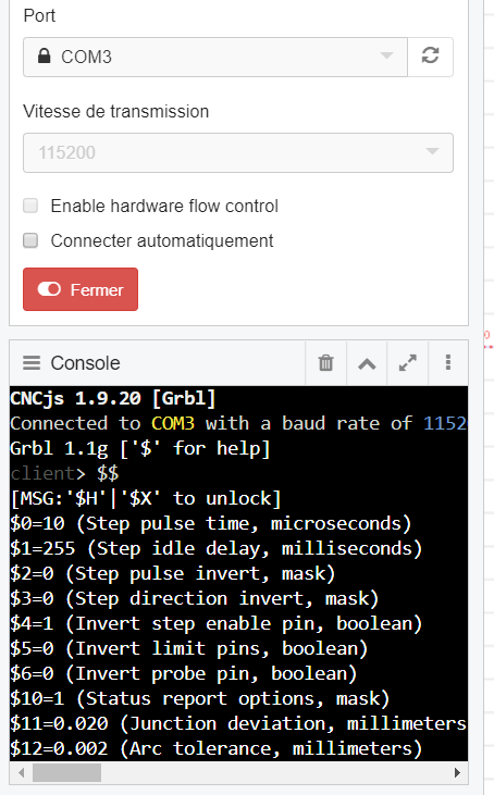 rampa Posté(e) Décembre 29, 2019 Auteur Posté(e) Décembre 29, 2019 Le programme de la machine est : GRLB control (candle). Sur le programme de la machine, j'ai taper "$$"dans la fenêtre et il ne ce passe rien, et quand je pousse sur le "+" ou les flèches de commande (sens avoir installé d'image), il ne ce passe rien, les commandes ne fonction plus, et quand je place le système de commande manuel, les avances et moteur fonctionne. Pour les "end-stops", je verrai plus tard pour en installer, mais pour le moment je doit pouvoir faire de très petites gravure. J'ai téléchargé le fichier "quadrifoglio.gcode" mais je n'arrive pas a le faire fonctionner (même la machine ne répond plus au clavier), l'image se place sur le programme de la machine, mais se connecte en "in queue" et n’avance pas, je n’arrive même plus a régler le "0". Je n'y comprend plus rien !!!!!.