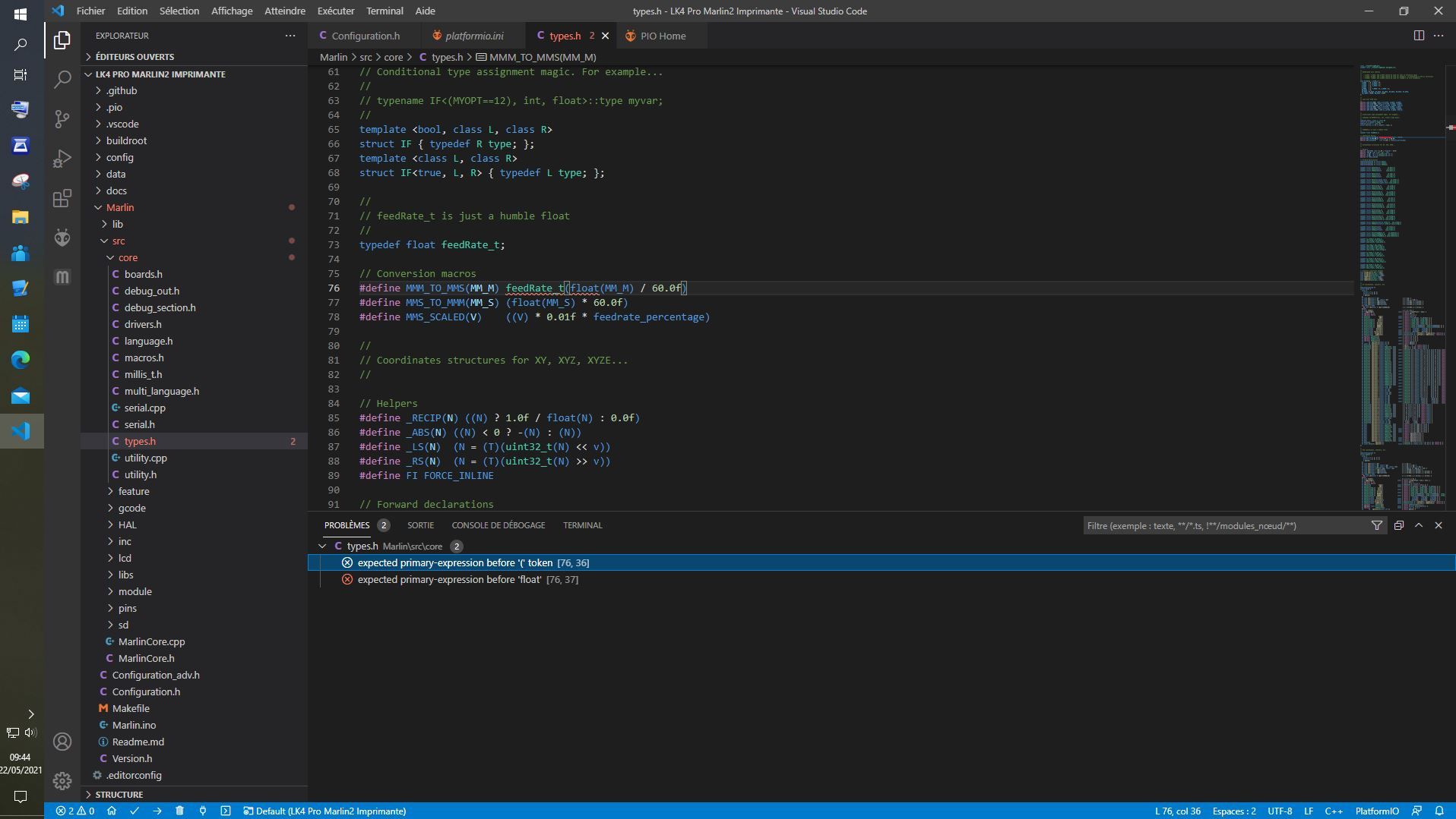 Thierry94 Posté(e) Mai 22, 2021 Posté(e) Mai 22, 2021 Bonjour, Il y a quelques mois je suis passé à Marlin2 sur ma LK4 Pro grâce à l'excellent travail de @DGR70 J'en avais profité pour passer de l'Arduino IDE à Visual Studio Code et tout c'était bien passé .. pas d'erreur de compil et transfert vers l'imprimante OK. Aujourd'hui je reprend le fichier config.h pour modifier le sens de mon moteur d'extrudeur (remplacement de l'extrudeur d'origine par un BMG de Trianglab), et je me retrouve avec des erreurs de compil sur le fichier types.h que je n'avais pas à mon passage en marlin 2. Dans le fichier config.h je n'ai modifié que la ligne ci-dessous que j'ai passé de true à false #define INVERT_E0_DIR false Avez vous une idée de se qui peut bien se passer car je n'ai pas utilisé VSC depuis mon passage sur Marlin2 ?