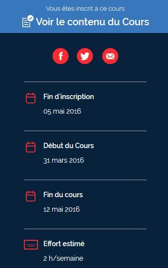 Roquesaltes Posté(e) Juin 13, 2016 Posté(e) Juin 13, 2016 Vi, je vais vous faire une pitite prèz. Le cours est effectivement terminé mais : Ce cours est terminé Vous pouvez néanmoins vous y inscrire, pour consulter les ressources disponibles en "mode archive", jusqu'au 22 décembre 2016.