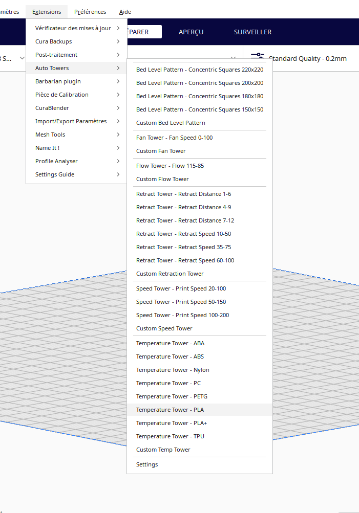 ANGE76 Posté(e) Décembre 3, 2023 Posté(e) Décembre 3, 2023 (modifié) RECTIFIER ET FAIT MIS EN FRANCAIS Il y a 3 heures, hyoti a dit : Bonsoir @ANGE76 215°C me paraît un peu beaucoup pour du PLA, mais faut voir. Pour faire une tour de température prend plutôt auto towers que dans pièce de calibration, Cela t'évitera de mettre des scripts de température. vois dans l'image ci-dessous. merci toit veut dire température towers -pla ils na pas auto towers comme instale les fichier de la version 5.3.0 Xma Modifié (le) Décembre 3, 2023 par ANGE76