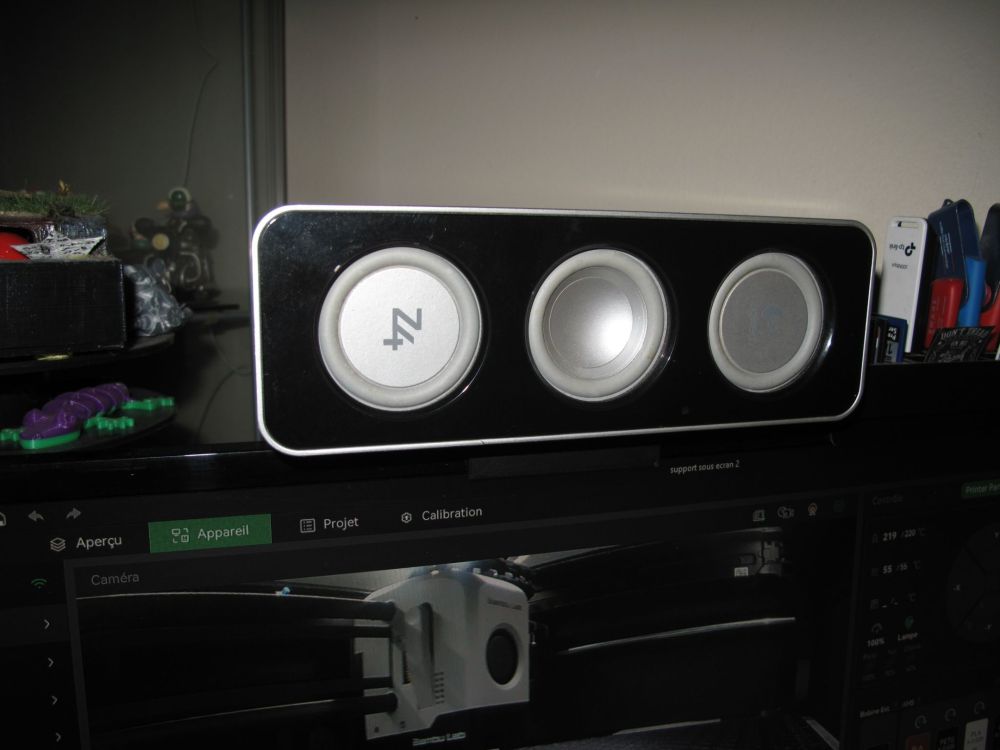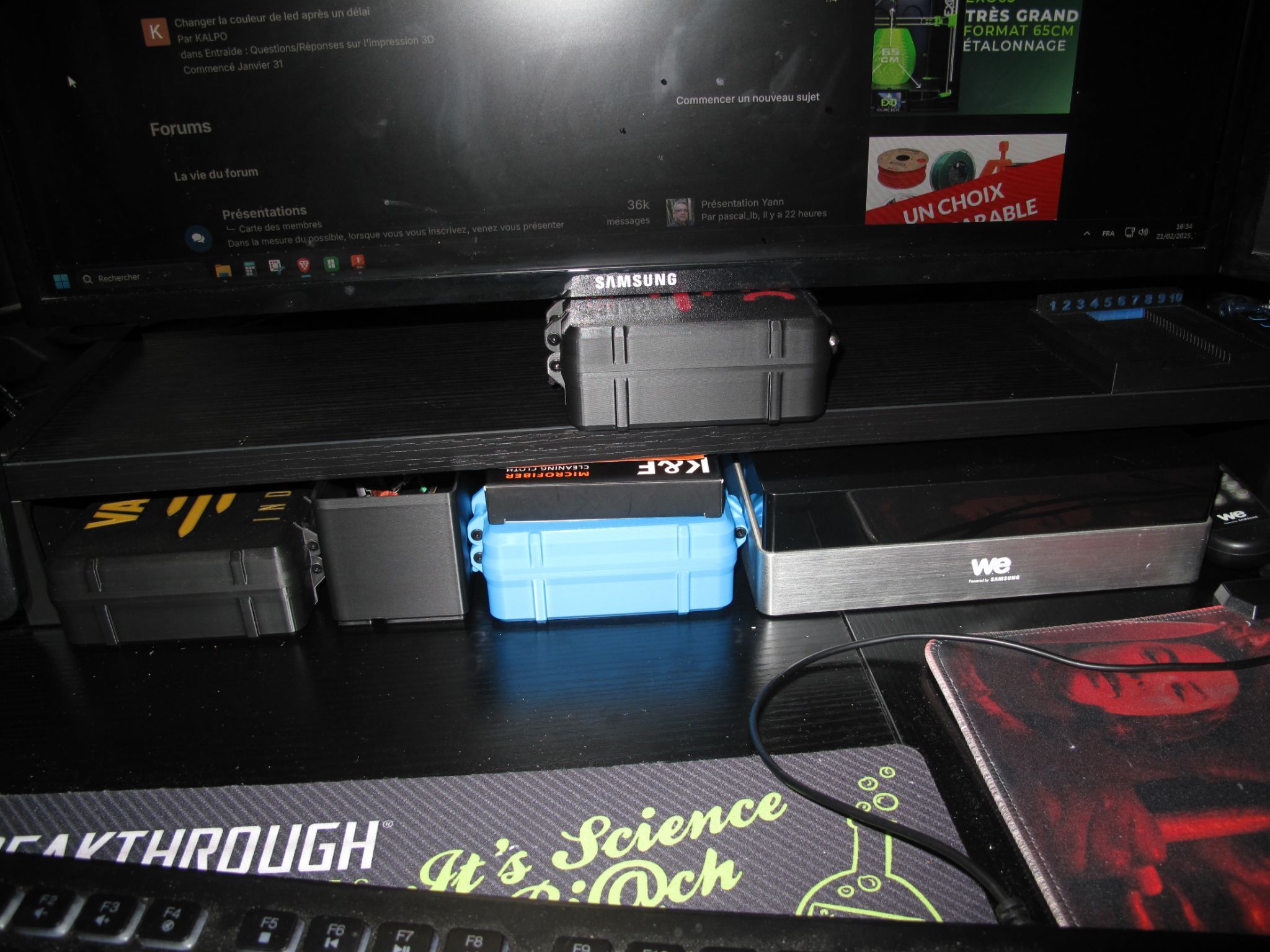 Ironblue Posté(e) Février 21 Auteur Posté(e) Février 21 (modifié) Je continue le rangement, j'attaque le bureau avec la partie sous les écrans. J'avais une étagère murale neuve qui trainait (2 dans le lot acheté mais besoin que d'une) donc plutôt que de la laisser dans un coin en attendant une hypothétique installation, je l'ai détournée de son utilisation première. étagère Modélisation de pieds C'est plus propre Bon du coup il a fallu changer de place les HP donc modélisation de "pieds" à mettre au dessus des écrans Et mise en place Avant Actuellement Reste le côté droit à faire mais plus d'étagère, ni rien qui traine et qui pourrait servir donc on imprime tout. Modifié (le) Février 21 par Ironblue 2 1