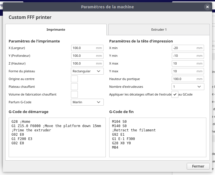 PPAC Posté(e) Mai 14, 2021 Posté(e) Mai 14, 2021 (modifié) Salutation ! Le 12/05/2021 at 14:27, TroisSix a dit : j'ai remarqué que les réglages de la tête d'impression étaient différents: qui dit vrai ? - dans 4.9 par défaut (3DN?) : X min : -20 mm / Y min : -10 mm / X max : 10mm / Y max : 10 mm - profil de 3D-Expert (4.8.x) : X min : -26 mm / Y min : -32 mm / X max : 32 mm / Y max : 34 mm - profil de 3DN (4.6.1 mais updaté en février) : X min : -26 mm / Y min : -32 mm / X max : 32 mm / Y max : 34 mm Le premier ressemble aux valeurs de base d'une imprimante "Custom FFF printer" que j'utilise pour créer un porfile pour ma K8200 ... en fait pour avoir vraiment le détail, il faut regarder les fichier .json du répertoire "definitions" mais ce n'est pas super simple a lire même si au moins ce n'est pas codé en binaire ... la version en cours du github de cura pour la genius https://github.com/Ultimaker/Cura/blob/master/resources/definitions/artillery_genius.def.json "inherits": "artillery_base" donc de https://github.com/Ultimaker/Cura/blob/master/resources/definitions/artillery_base.def.json qui elle même "inherits": "fdmprinter", qui se trouve être la "Custom FFF printer" ... https://github.com/Ultimaker/Cura/blob/master/resources/definitions/fdmprinter.def.json Modifié (le) Mai 14, 2021 par PPAC