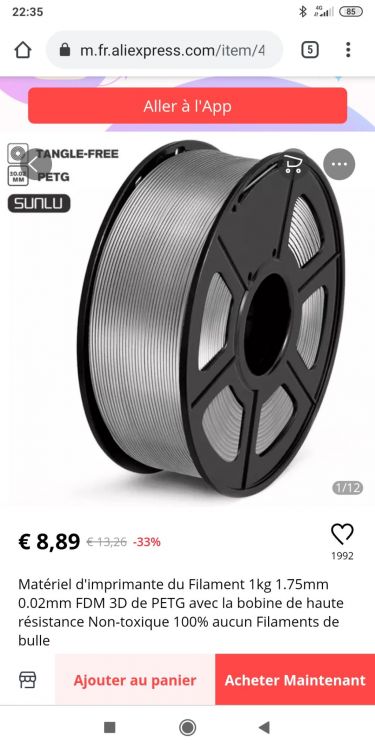 RT36 Posté(e) Novembre 28, 2020 Posté(e) Novembre 28, 2020 (modifié) c'est encore moins cher sur leur site officiel ... j'ai pris 2 kg de PETG récemment, et une des deux bobines est vraiment mal enroulée (j'ai contacté le sav ... après avoir reconnu le problème et s'est excusé, silence radio ...) pour le reste, ça s'imprime bien, pas de warping, un peu de stringing, mais bon, c'est du PETG, voila Modifié (le) Novembre 29, 2020 par RT36