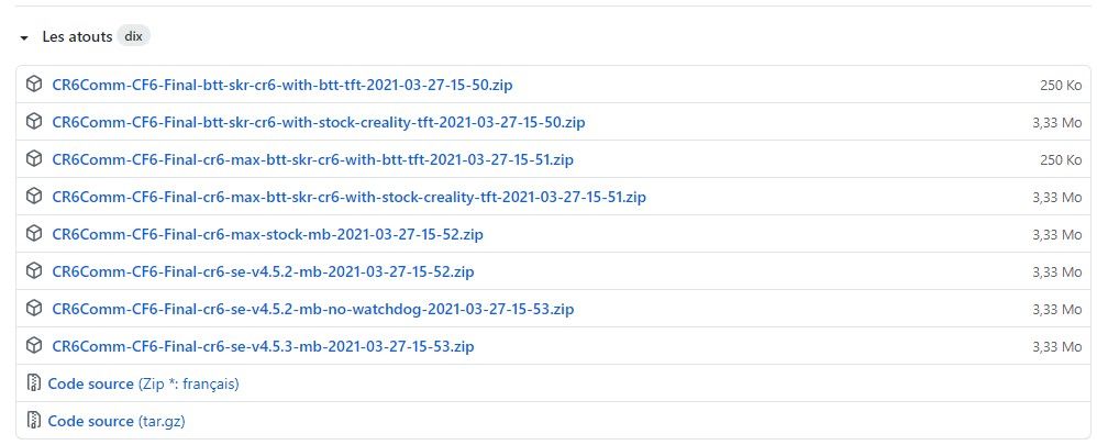 fran6p Posté(e) Avril 17, 2021 Posté(e) Avril 17, 2021 As-tu lu le descriptif, certes en anglais (tout en bas de mon lien) ? En fait ça dépend de la carte mère installée dans ta CR6-SE. Quelle est sa version (c'est indiqué sur la CM donc il faut ouvrir le boitier)? Carte Creality ou BigTreeTech (ça normalement tu dois le savoir si tu as remplacé la carte d'origine par une autre)? La mienne provenant du Kickstarter, la CM est en 4.5.2 (j'ai également au cas où une BTT). Donc pour le firmware, il faut que je prenne celui nommé : Citation File name Description SHA256 hash --------- ----------- ----------- CR6Comm-CF6-Final-cr6-se-v4.5.2-mb-2021-03-27-15-52.zip CR-6 SE (v4.5.2 motherboard) D656E2A53A62EFAC52308210E1D4466CF0B966A7E748A36A6151D9DA51C6D2B7 CR6Comm-CF6-Final-cr6-se-v4.5.2-mb-no-watchdog-2021-03-27-15-53.zip CR-6 SE (v4.5.2 motherboard) (no watchdog - caution - thermal runaway possible!) AD4122A8EC477D48D713D84BC2C24CCED92F17079FC65712918101C0F89C6779 CR6Comm-CF6-Final-cr6-se-v4.5.3-mb-2021-03-27-15-53.zip CR-6 SE (v4.5.3 or v1.1-ERA motherboard) 1F713C01A02D6380B16EE64D877B40068F18166BA554B4A36FD0CD450652A185 CR6Comm-CF6-Final-btt-skr-cr6-with-stock-creality-tft-2021-03-27-15-50.zip CR-6 SE with BigTreeTech SKR CR6 and stock Creality screen AA67A30BB7045F8B5C8C1C7C276B2258B746AE2C49237C9255447DFFDFE47FBF CR6Comm-CF6-Final-btt-skr-cr6-with-btt-tft-2021-03-27-15-50.zip CR-6 SE with BigTreeTech SKR CR6 and BTT TFT D93197F196432635FAF20648410CE9ECB20DE7737BF54E97C5B663A55139541F Si tu as la même carte et qu'après flashage, ton imprimante redémarre (reboot) seule alors il faudra installer celui qui comporte dans le nom de fichier le «no-watchdog». Si ta carte est en version 4.5.3, prendre celui dont le nom comporte cr6 et v4.5.3 Si tu as remplacé la carte originelle par une BTT, je te laisse trouver celui que tu dois prendre Si tu veux compiler ton propre firmware, tu récupères le «source files» 1