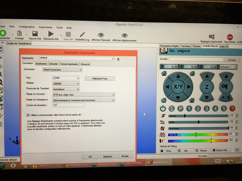 scarou Posté(e) Février 4, 2015 Posté(e) Février 4, 2015 REPETIER : - Affiche les log afin de pouvoir lire les message d'erreur (Bouton Easy mode en rouge, puis clic sur "Visibilité Log". Les log apparaissent alors en bas de l'écran. - Fait un Alt + E afin de voir les réglages de l'EEPROM et fait une capture écran ) Config.h - Si communication à 115000 bauds, ne pas oubier de changer la vitesse dans ton config.h également - Définition du type de thermistance :Tu es règlé sur "// 1 is 100k thermistor - best choice for EPCOS 100k (4.7k pullup)" c'est ce que tu as choisi ou tu as laissé par défaut ? (Une mauvaise info à ce niveau peutmettre en défaut ton REPETIER) - Ecran LCD... heu.. qu'est-ce que tu n'as pas compris dans ce qui t'as déjà été dit auparavant ? Voici un extrait de ton Config.h : // The RepRapDiscount FULL GRAPHIC Smart Controller (quadratic white PCB) // http://reprap.org/wiki/RepRapDiscount_F ... Controller // // ==> REMEMBER TO INSTALL U8glib to your ARDUINO library folder: http://code.google.com/p/u8glib/wiki/u8glib //#define REPRAP_DISCOUNT_FULL_GRAPHIC_SMART_CONTROLLER Comme tu semble ne pas avoir suivi les conseils déjà prodigués, Oui...mais non... Comme cela t'as été dit plus haut, les imprimante 3D "autoconstruites" sont des machines capricieuses et il est important de faire l'effort de comprendre chaque manipulation afin de maitriser un minimum le comportement de ta machine. Le paramétrage de ton Marlin est un basique à maîtriser impérativement. Sinon, je crains que tu n'aille de désillusions en désillusions car au moindre résultat résultat inapproprié ou pépin, tu sera revenu au point de départ. Rassure toi,les débuts sont chaotiques, mais les résultats sont gratifiants. Pour ton écran LCD, commence par lire ça (Installer un écran LCD) et reviens nous dire ce qui va bien et ce qui va pas bien par rapport à ton cas en particulier. ...je vais m'arrêter là et attendre que tu ai passé ce stade... Courage...