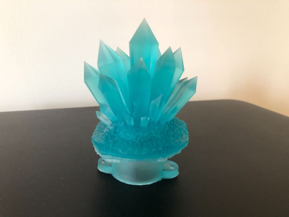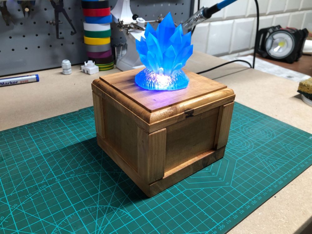Pioux57 Posté(e) Mai 26, 2021 Posté(e) Mai 26, 2021 Encore un petit projet terminé. Une veilleuse de nuit pour ma fille, constituée d'un cristal imprimé avec mon Elegoo Mars Pro 2 en utilisant la résine bleue translucide de la même marque. Le modèle d'origine de SenseiRalph sur Cults3D a été légèrement modifié pour permettre de le fixer à la base et d'y loger 4 LEDs RGB. J'ai fait face à un problème de décollement des couches de la base du cristal car je ne l'avais pas imprimé incliné (et oui je débute). J'ai donc joué de la lime pour qu'il s'adapte à mon logement. Le cristal repose sur une petite base en bois massif de récup (lamellé/collé+bois de caisse de vin ) verni qui contient la partie électronique (Arduino). Je vous mets quelques étapes de la fabrication de la base. La boite est assez simple avec 4 montants dans lesquels viennent se glisser les côtés. Le tout fixé par tourillons pour éviter les vis apparentes. Les LEDs sont insérées dans les logements prévus à cet effet à la base du cristal. La précision de la Mars Pro 2 est incroyable, j'avais mesuré les LEDs au pied à coulisse et dimensionné les trous à la mesure exacte et le résultat est parfait. Les LEDs entrent dans les trous et restent fichées dedans sans fixation supplémentaire. Je vous montre un peu le câblage de l'électronique réalisée. Une fois l'électronique achevée et la carte Arduino programmée, voila le résultat: Le programme de l'Arduino, le STL et le dessin technique de la base en bois sont disponibles sur mon GitHub pour ceux qui voudraient la reproduire. 3 1