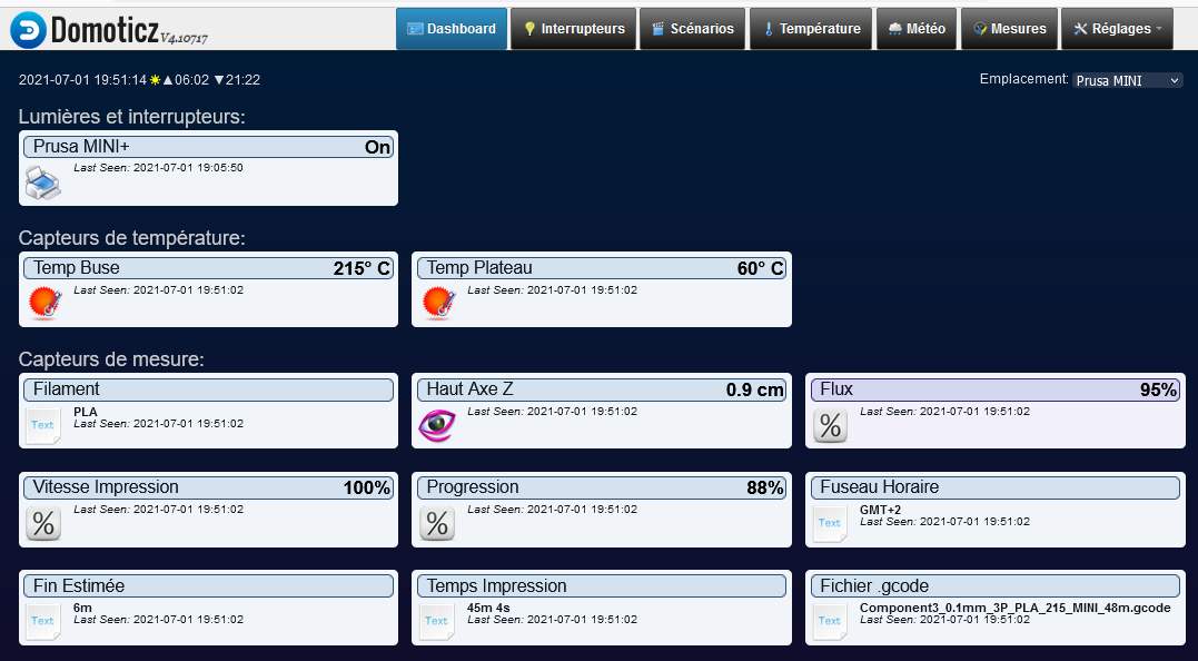 jcjames_13009 Posté(e) Juillet 5, 2021 Posté(e) Juillet 5, 2021 Salut Voici un truc (Absolument « indispensable » à la bonne utilisation de nos MINI+ ) que j’ai découvert en fouillant par ci par là…. Il est possible de récupérer des infos de télémétrie venant de nos Prusa MINI+ et de les afficher dans un système Domotique Pour récupérer les info il suffit d’envoyer la commande suivante http://AdressIP/api/telemetry et l’imprimante renvoie un truc comme ça (C’est du JSON) Après traitement ça donne ça dans Domoticz Ce sont les données brutes. On peut à partie de là afficher on peut par exemple le statut de l'imprimante (On / Impression / Off), l'heure de fin d'impression, etc... C’est utilisable dans n’importe quel système Domotique (JEEDOM, Home Automation, etc…) Voilà si vous voulez plus d’info sur comment transformer et afficher les info dans Domoticz je peux vous faire un petit tuto Bonnes impressions JC 1