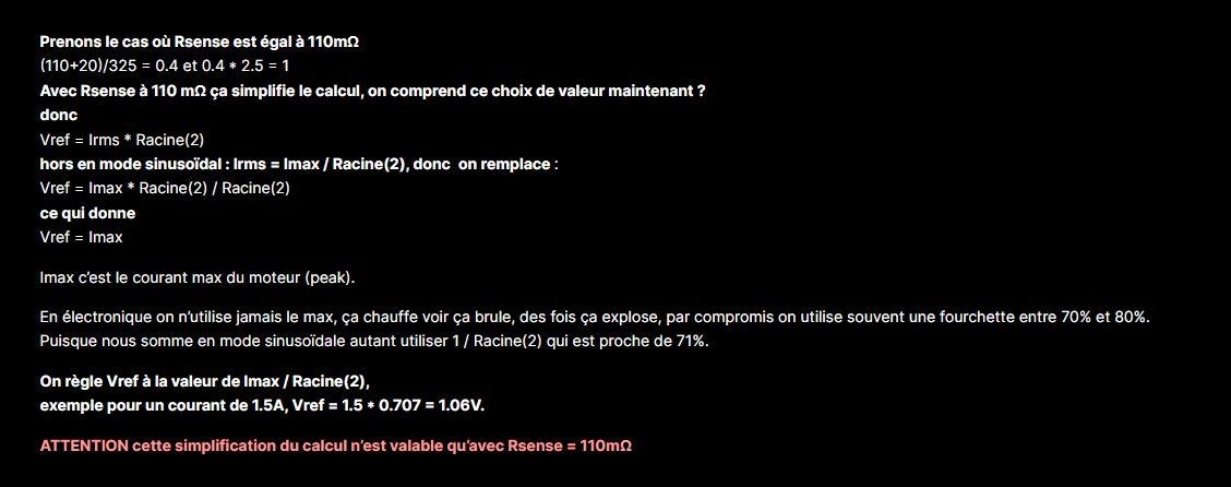Yamh Posté(e) Aout 29, 2021 Posté(e) Aout 29, 2021 (modifié) Oui les Rsense sont toutes en 0.11 ohms sur ta carte SKR Mini E3. Par contre je ne pense pas que les moteurs 42-34 fassent 1.5A, quand j'avais configuré mes 42-34 Creality j'avais trouvé 1.0A en fouinant. Ça n'engage que moi mais j'ai programmé les miens à 800mA pour les 42-34 en XYZ, ça ne chauffe pas et je peux me permettre d'imprimer rapidement sans sauts de pas. EDIT : tu as posté avant moi , je dirais qu'il ne faut pas croire les caractéristiques de la page Creality. Si tu regardes le moteur 42-40, il a la même intensité max..c'est plutôt bizarre. Et 1.5Amax sur un 42-34 me parait disproportionné. Je reprends ta phrase pour que tu comprennes mieux : "si je comprend bien pour calculer Vref on fait simplement un calcul pour trouvé l'IRMS ?" : On n'utilise pas Vref, donc on ne le calcule pas, à l'inverse on l'utiliserait si on était pas connecté en UART. Là vu qu'on est connecté en UART, le processeur de la SKR Mini E3 "transmet" au TMC2209 la valeur de Irms et de Rsense, et c'est le TMC2209 qui va gérer la limitation en interne.Il n'y a pas de Vref à calculer, on donne simplement Irms et Rsense. Modifié (le) Aout 29, 2021 par Tekila63 1