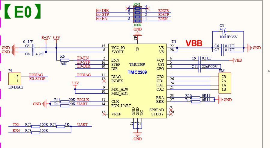 Yamh Posté(e) Aout 29, 2021 Posté(e) Aout 29, 2021 (modifié) Les drivers TMC2209 de la SKR Mini E3 V2.0 sont intégrés à la carte mère et connectés en UART : Exemple pour E0 :VREF n'est pas utilisé comme le Driver est connecté en UART, on peut le voir non-connecté sur la Broche 17 du schéma. Marlin a besoin de deux constantes pour communiquer en UART la limitation du courant au TMC2209 : - E0_RSENSE : La résistance de Rsense en Ω. - E0_CURRENT : Le courant RMS du moteur connecté en mA. E0_RSENSE correspond aux résistances R10 et R12 sur le schéma (une pour chaque bobine du moteur). Le marquage 0R11 = 0.11Ω E0_CURRENT correspond au courant RMS du moteur Nema14 du Biqu H2, il faut donc aller sur la page du constructeur pour pêcher les infos. On peut y trouver "Recommended motor current : 800mA", sauf que généralement les constructeurs donnent le courant "Max" et non "RMS". Une méthode simple pour la conversion : IRMS = 0.71 x IMAX IRMS = 0.71 x 800IRMS = 568mA Ce qui nous donne dans Configuration_adv.h : Modifié (le) Aout 29, 2021 par Tekila63 1