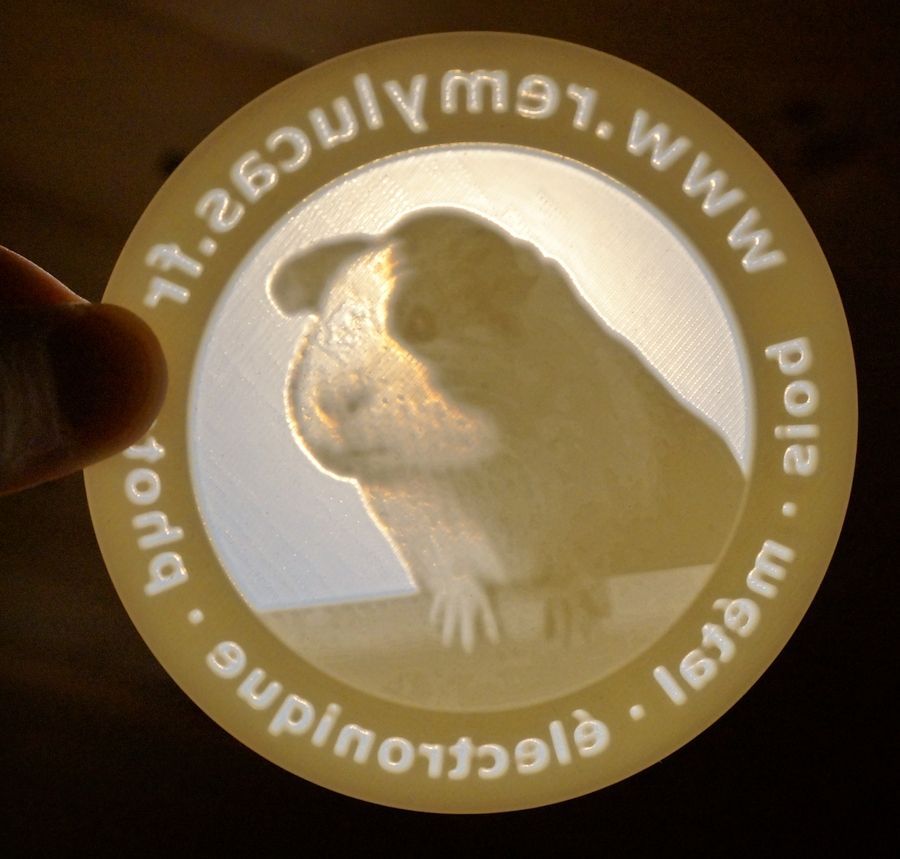 Kachidoki Posté(e) Novembre 3, 2021 Posté(e) Novembre 3, 2021 Sinon il y a une autre technique plus simple, on se focalise toujours trop sur une seule techno pour tout faire, ici l'impression 3D. Tu peux tout aussi bien avoir une plaque lisse, et y coller en dessous une feuille de papier imprimée en 2D et en prime, avec les motifs en couleurs ! Pour moi l'intérêt de la lithophanie imprimée en 3D, c'est d'avoir des effets de reliefs "stéréoscopiques", car même les ombres peuvent se "simuler" avec une impression papier. 2
