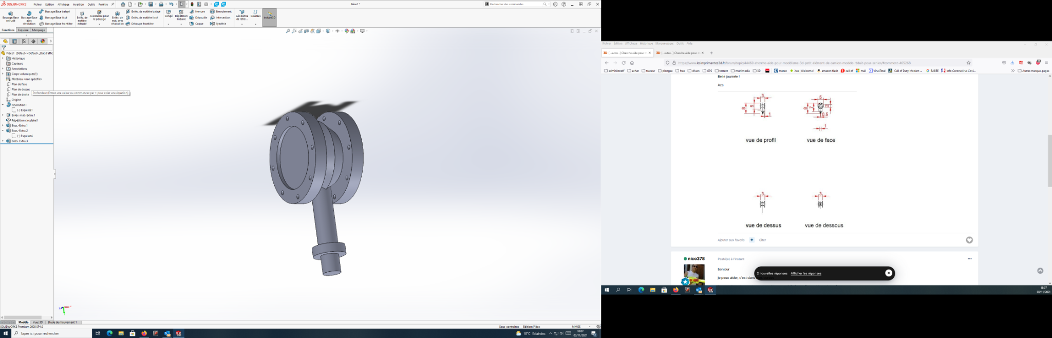 Invité Posté(e) Novembre 3, 2021 Posté(e) Novembre 3, 2021 Bonjour, Je cherche à venir en aide à mon grand oncle qui fait du modélisme. Il souhaite que je lui imprime en 3D des vannes pour transformateur pour son projet (qui lui tient à cœur, camion de son enfance)... Hélas je ne sais pas modéliser pour le moment Du coup je lance en bouteille à la mer son projet (cf. image ci dessous avec les côtes, pas besoin de filetage ou de trous sur les brides, tout est plein.. si vous pensez qu'il vaut mieux faire un fichier pour les brides et le corps de vanne à part aucun souci, j'imprime et je colle ensuite) Merci à qui aura le temps de m'aider en modélisant ceci que je puisse lui imprimer ^^ Belle journée ! Aza
