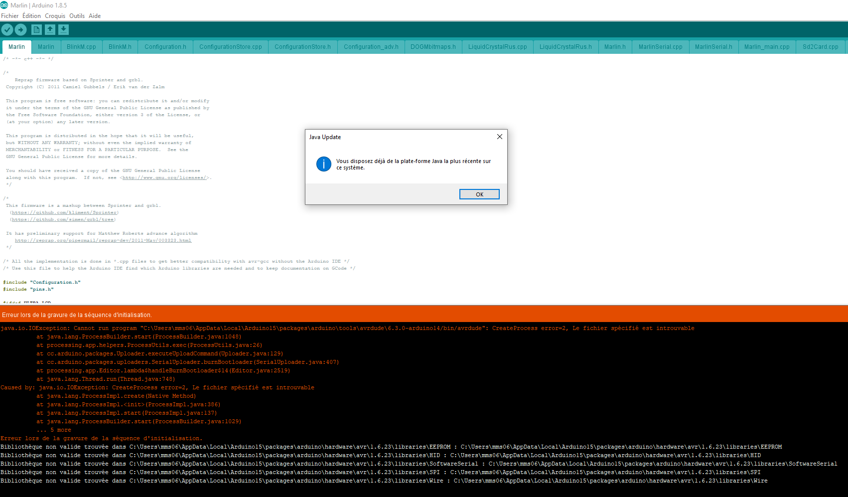 Maeke Posté(e) Février 15, 2022 Posté(e) Février 15, 2022 (modifié) As tu bien fait ce qui est écrit à l'étape 1? Et vérifies que java est installé et opérationnel. Le message d'erreur indique très clairement un fichier manquant et toutes les erreurs sont liées à java. Et si tu utilises arduino ide, les versions récentes sont partiellement incompatibles avec les cartes anet (à cause d'une seule et unique librairie), par contre arduino ide 1.8.5 devrait fonctionner (ou tu peux chercher sur internet ou ce forum plus d'info sur cette incompatibilité pour savoir quelle librairie downgrader, désolé mais les tutos d'olivier ne sont pas à jour sur cette incompatibilité pour autant que je sache). Modifié (le) Février 15, 2022 par Maeke