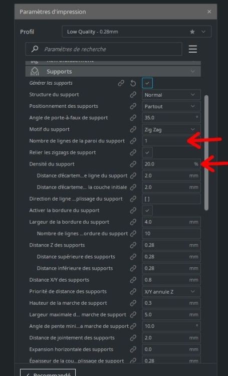 ppx32 Posté(e) Mars 19, 2022 Posté(e) Mars 19, 2022 Bonjour à tous, Pour un STL sous cura , je souhaiterais épaissir la largeur du support car à chaque fois problème d'impression . Le support généré par Cura est trop fin . Quelle serait le paramétre à changer ? (J'ai déja basculé en ZigZag pour le solidifier . Merci de votre retour
