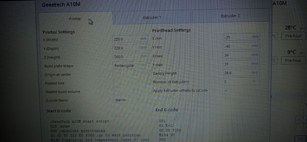 Wirlked Posté(e) Avril 20, 2022 Posté(e) Avril 20, 2022 (modifié) Bonjour, comme je l expliquai dans ma longue présentation, j ai des soucis avec une A10M. J ai remplacé la tête par celle que je viens de recevoir et le soucis reste le même. Certe la buse aurait posé un jour un soucis mais il s avère qu en fait le soucis est ailleurs. J ai baissé les bras il y a un an et demi mais cette fois je veux trouver car elle n a jamais imprimer plus loin que le chien et se sans tête. Le fil de la 2eme bobine bourre.... En cherchant dans Cura je vous que Extruder 2 est a une température de 0 alors que le 1 est a température ambiante ! Pourtant les 2 extruders sont biens dans la config. Je suis alors allé dans les options de l imprimante et la, il n y a qu un seul extruder. Je ne sais plus quoi faire. Si l extruder 2 ne chauffe pas normal que ca se bouche ? (Enfin si ca fonctionne ainsi). J avais bien 2 couleurs sur la toute première impression il y a un an et demi. Pb d un truc que j ai toucher ? Mauvaise manip lors de l installation de Cura ? Ci dessous les bouchons que j ai eu avec 2 marques de PLA blanc et un autre en gris. Et le bouchon que nous avions eu il y a un an et demi. Help Modifié (le) Avril 20, 2022 par Wirlked