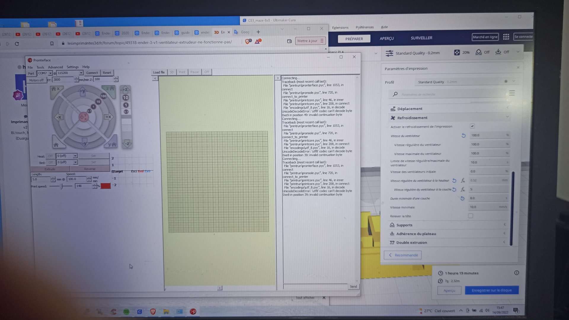 - J'ai testé une impression avec les paramètres de refroidissement Cura recommandés par @hyoti, toujours aucun de signe de vie du ventilo