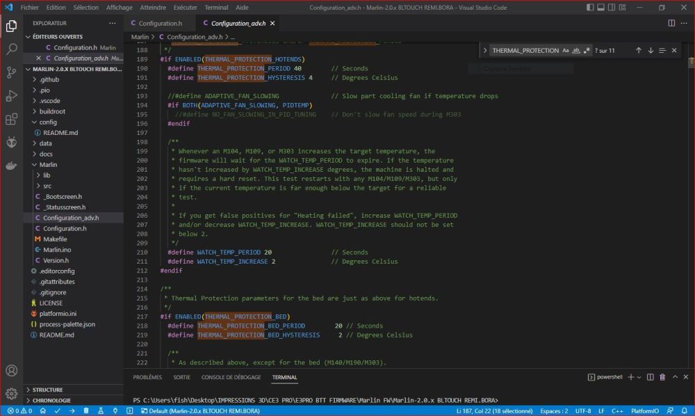 Une fois compilé je balance la sauce et là c'est la fête aux erreurs (auto bed leveling ??? (disparu depuis), mais surtout "Heating failed, system stopped! Heater_ID: bed" voir même une ou deux fois idem pour E0 (pas revu depuis....)
