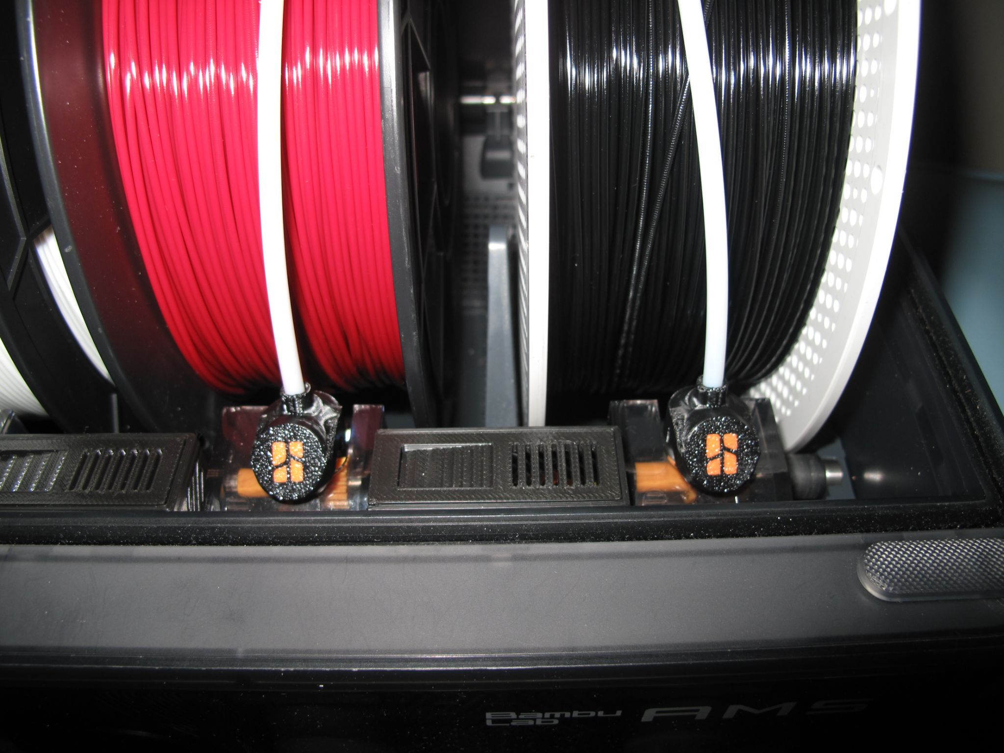 Dernières impressions pour l'AMS, une protection pour l'entonnoir de l'alimentation en filament de l'AMS (apparemment ça s'use vite, j'ai pas remarquée d'usure sur les miens...) et un autre truc qui soit disant protège les moteurs, le trémie d'alimentation et empêche les mauvais rembobinage.... A voir aussi si ça une réel incidence mais je n'ai eu que une ou deux fois un mauvais rembobinage sur des  bobines pratiquement vide depuis que j'ai l'imprimante....