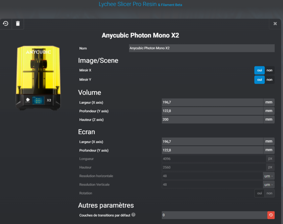 PPAC Posté(e) Janvier 20, 2023 Posté(e) Janvier 20, 2023 (modifié) Salutation ! J'ai le plaisir d'avoir à tester une imprimante "Anycubic Photon Mono X2" Félicitation à @Poisson21 pour l'avoir identifié lors du "Quoi qu'est-ce ?". Une imprimante résine UV avec une dalle source UV "LightTurbo" un écran LCD de masquage 9.1" monochrome de 4096 x 2560 pixels un volume d'impression de de 196.7 x 122.8 x 200 mm taille pixel de 48μm. Liens l'article de test https://www.lesimprimantes3d.fr/test-anycubic-photon-mono-x2-20230205/ sur le comparateur https://www.lesimprimantes3d.fr/comparateur/imprimante3d/anycubic/photon-mono-x2/ sur le(s) site(s) du constructeur Anycubic (fr) https://www.anycubic.fr/products/photon-mono-x-4 (en) https://www.anycubic.com/collections/anycubic-photon-3d-printers/products/photon-mono-x2-sla-3d-printer Discord "Anycubic Community" https://discord.gg/W2jquw3HfK Facebook de Anycubic https://www.facebook.com/ANYCUBIC3dprinter Groupes ? https://www.facebook.com/groups/anycubicphotonmonoseries/ Instagram de Anycubic (en) https://www.instagram.com/anycubicofficial/ (de) https://www.instagram.com/anycubic_deutschland/ Noter que la fiche produit sur le (en) ".com" est plus complète/détaillée. Elle propose des "addons" et a une partie "Anycubic Care" (vers la fin de la page) plus complète (Firmware, Slicer, ...). (Mais attention pour l'addon du "FEP 5 Pcs", bien sectionner le bon via la combo box sinon ce n'est pas le bon de sélectionné par défaut ... ) Modifié (le) Février 5, 2023 par PPAC 3
