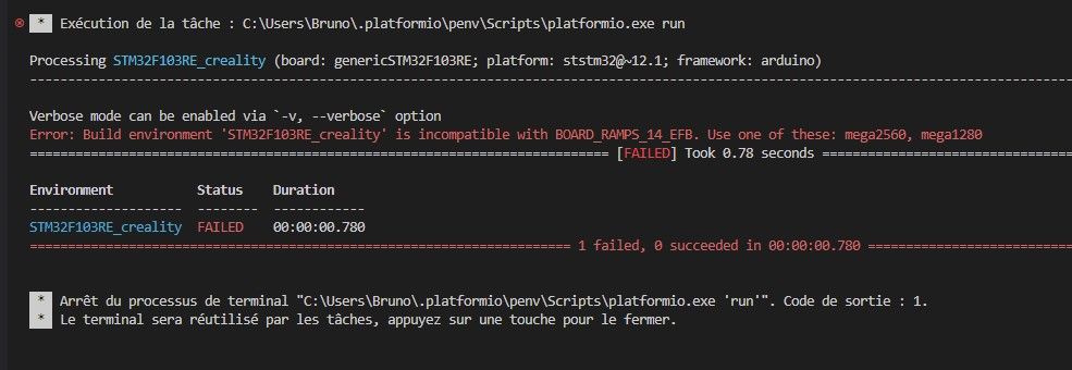 Meegolo Posté(e) Février 3, 2023 Auteur Posté(e) Février 3, 2023 Voici les erreurs. Tout ce que j'ai fait dans platformIO.ini c'est d'avoir changé ceci STM32F103RE_creality Voici les erreurs Citation Error: Unknown environment names 'STM32F103RE_creality'. Valid names are 'at90usb1286_cdc, mks_robin, FYSETC_S6, LPC1769, at90usb1 286_dfu, teensy41, jgaurora_a5s_a1, mks_robin_e3, LERDGES, chitu_f103, STM32F103CB_malyan, DUE_debug, STM32F103VE_GTM32, chitu_v5_ gpio_init, STM32F103RE, DUE_archim, DUE_archim_debug, mega1280, BIGTREE_SKR_PRO, teensy35, MightyBoard2560, esp32, Anet_ET4_OpenBL T, mks_robin_lite3, sanguino644p, REMRAM_V1, FYSETC_E4, STM32F103RC, mks_robin_nano_v3, mks_robin_pro, LPC1768, sanguino1284p_opti mized, linux_native, SAMD51_grandcentral_m4, STM32F070CB_malyan, flsun_hispeedv1, melzi_optiboot, malyan_M300, STM32F401VE_STEVAL, mks_robin_e3p, LERDGEX, trigorilla_pro, mks_robin_lite, FYSETC_F6, teensy36, NUCLEO_F767ZI, STM32F407VE_black, rambo, STM32F103RE _btt_USB, LERDGEK, STM32F103RC_fysetc, STM32F103RC_btt_USB, BIGTREE_SKR_PRO_usb_flash_drive, STM32F103RE_btt, mks_robin_nano35_stm 32, DUE_USB, STM32F103RET6_creality, mks_robin_stm32, BIGTREE_BTT002, mks_robin_nano35, melzi_optiboot_optimized, BIGTREE_GTR_V1_0 _usb_flash_drive, rumba32, STM32F103VE_longer, FLY_MINI, FLYF407ZG, ARMED, STM32F103RC_btt, sanguino1284p, mks_robin_pro2, MightyB oard1280, STM32F103RC_btt_512K_USB, mega2560, melzi_optimized, mks_robin_nano_v3_usb_flash_drive, mega2560ext, mks_robin_mini, tee nsy31, include_tree, STM32F103RC_btt_512K, BIGTREE_GTR_V1_0, STM32F103RC_meeb, STM32F070RB_malyan, DUE, melzi'