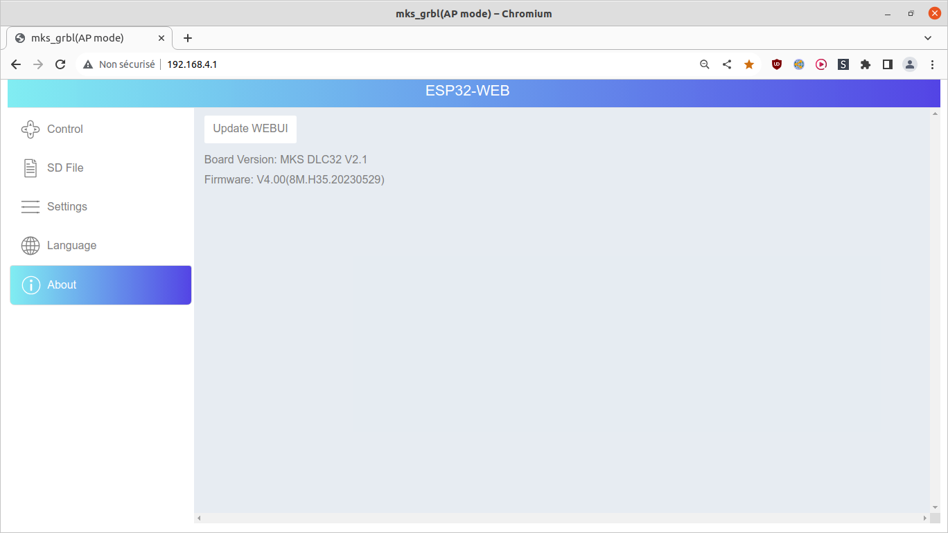 PPAC Posté(e) Aout 27, 2023 Auteur Posté(e) Aout 27, 2023 (modifié) Mise en fonction Brancher l'alimentation secteur et utiliser le bouton a bascule "marche/arrêt" pour allumer le graveur laser. L'écran de contrôle devrait s'allumer et afficher l'écran d’accueil ( Bien remarquer que a l'allumage quelque soit la position réel de la tête laser, le firmware considère être en X=0.00 et Y=0.00 ) Menu "Tool" Sous menu "Wi-Fi" du menu "Tool" ( "WIFI:" le SSID/ nom du réseau du point d'accès Wi-Fi, "IP:" l'adresse IP du graveur laser sur se réseau Wi-Fi ) Accès via Wi-Fi avec un navigateur web Il faut absolument, avoir mis une carte micro SD dans le graveur laser, sinon il n'est pas possible de téléverser et de lancer une gravure d'un fichier. Pour se connecter au Point d'acces Wi-Fi fourni par le graveur laser, quand il est allumé. Comme vu dans, le sous menu "wifi", du menu "tools", de l’écran de contrôle, je cherche le réseau "MKS_DLC9382" Exemple sous une Ubuntu 20.04 ( là je suis déjà connecté mais pour illustrer le choix du réseau ... ) mot de passe par défaut "12345678" Après la connexion au réseau effectué, dans un navigateur internet ( Chrom/Chromium, Firefox, Edge ...) se connecter a l'adresse IP vu dans, le sous menu "wifi", du menu "tools", de l’écran de contrôle, donc une url du genre http://192.168.4.1 On arrive alors, normalement sur une phase de chargement Puis sur la page d'accueille (Onglet "Control" sélectionné) (Là j'ai fait un "ctrl"+"rotation molette sourie" pour dé-zoomer, afin d'avoir plus d’éléments de visiblement par capture d’écrans.) Onglet "SD File" Onglet "Settings" ( On retrouve les paramètres "$$" d'un firmware GRBL et des paramètres spécifique a cette version MKS du firmware.) Citation Onglet "Language" Onglet "About" Sujet en cours de réalisation. Il sera complété bientôt. Modifié (le) Septembre 3, 2023 par PPAC