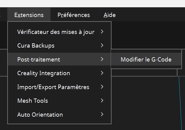 Pour avoir un aperçu de la pièce à imprimer sur la machine et dans Creality Print il va falloir faire des manipulations dans les Extensions – Post-Traitement – Modifier le G-Code.