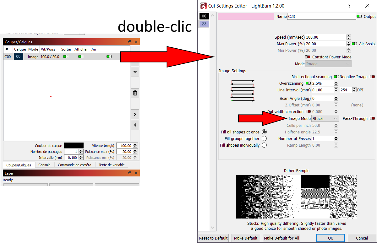 fran6p Posté(e) Décembre 8, 2024 Posté(e) Décembre 8, 2024 Ton laser, il est capable de couper les matériaux correctement ou pas. Les deux matériels que j'ai eus à tester (un 5 W et un 10 W optiques) coupaient du CP ou du MDF à des vitesses bien plus rapides que ton 30 W lors de tes gravures, donc j'en viens à soupçonner le matériel . Est-ce réellement un 30 W optique (combine habituellement six lasers de 5 W) ? Juste pour info : habituellement avec les lasers diodes « bleues », on utilise la mesure de la vitesse en mm/min plutôt qu'en mm/s (1200 mm/min = 20 mm/s), même si à la fin, on aura les mêmes vitesses de déplacement. Avec Lightburn, un paramètre est à modifier quand on fait de la découpe ou de la gravure : le « constant power mode » (à cocher pour de la coupe, décocher pour gravure).