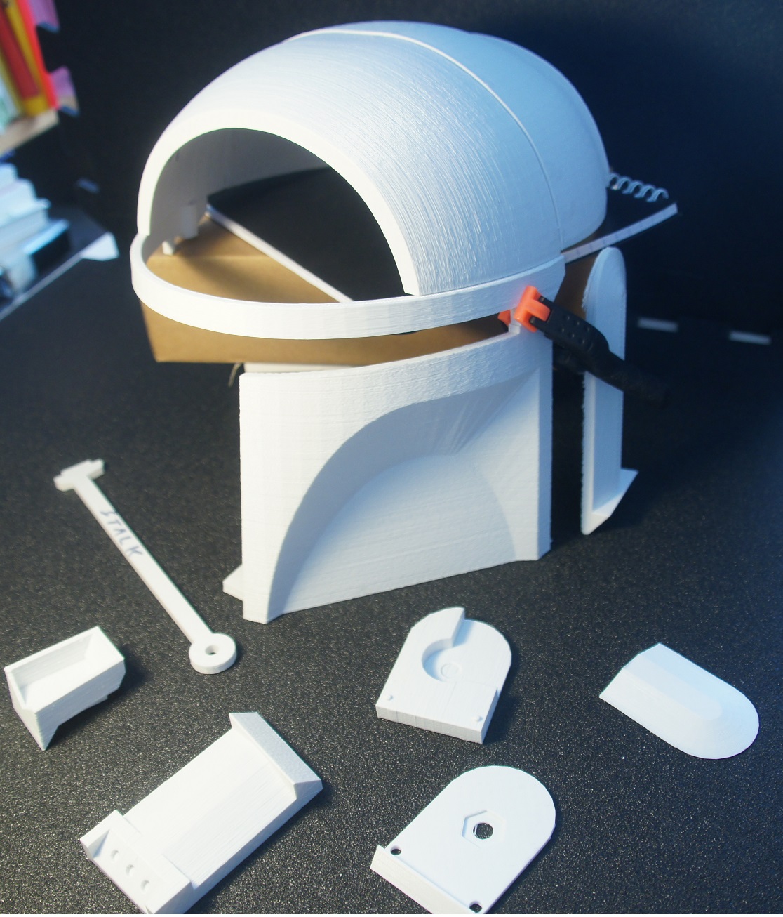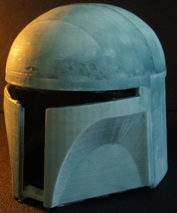 migreur Posté(e) Décembre 20, 2016 Posté(e) Décembre 20, 2016 Bonjour, je me prépare pour le carnaval du lycée avec une tenue de Boba Fett de la trilogie Star Wars. J'ai l'habitude de faire mes déguisements en tapis de sol (je suis du milieu du GN), mais là je butte sur le casque. Et comme j'ai une printeuse depuis un mois, que j'ai trouvé les plans du casque (ici : lien vers Thingiverse), je me suis dis pourquoi pas ! Après calcul j'estime en avoir pour 10 jours d'impression (9 des pièces dépassent les 8h d'impression), avec un total d'environ 87h (sans compter les petites pièces de 2~3h qui prendront une quinzaine d'heure). Je n'ai pas encore fait l'estimatif pour la quantité de fil consommé. Par rapport aux fichiers d'origine, j'ai coupé les 2 hémi-dômes en 2 (dans le sens de la hauteur) avec netfabb de manière à réduire la quantité de support. Le collage sera effectuée avec de la colle chaude, puis le revêtement finale sera un enduit de résine polyester renforcée de fibre de verre (objectif triple : protéger le PLA de la dégradation au cours du temps, renforcer le casque, lisser la surface pour un meilleur rendu). Printeuse : Wanhao Duplicator i3 ; épaisseur des couches : 0.25 mm (rapide). Collage des pièces sur le raft à la colle chaude.