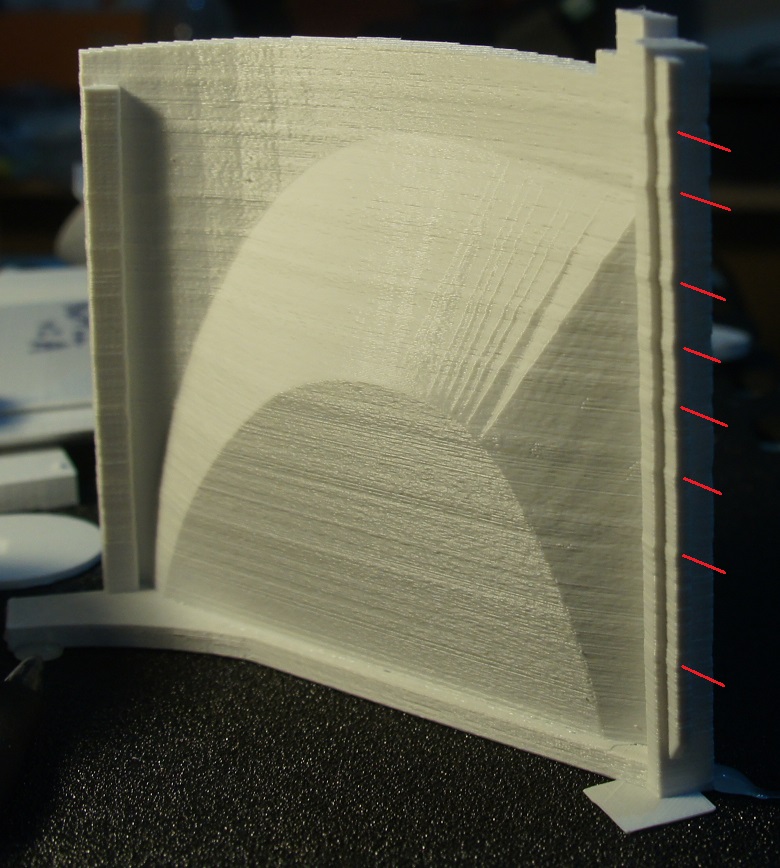 migreur Posté(e) Décembre 23, 2016 Auteur Posté(e) Décembre 23, 2016 print du jour, bonjour.... et des problèmes... sur la photo de gauche, on peut remarquer des ondulations marquées en rouge (selon l'axe Y du plateau)... pas vraiment régulier, mais approximativement toutes les 40 à 60 couches environ. Problème de tension des courroies ? autre chose.... C'est la première fois que je constate cela sur une pièce.