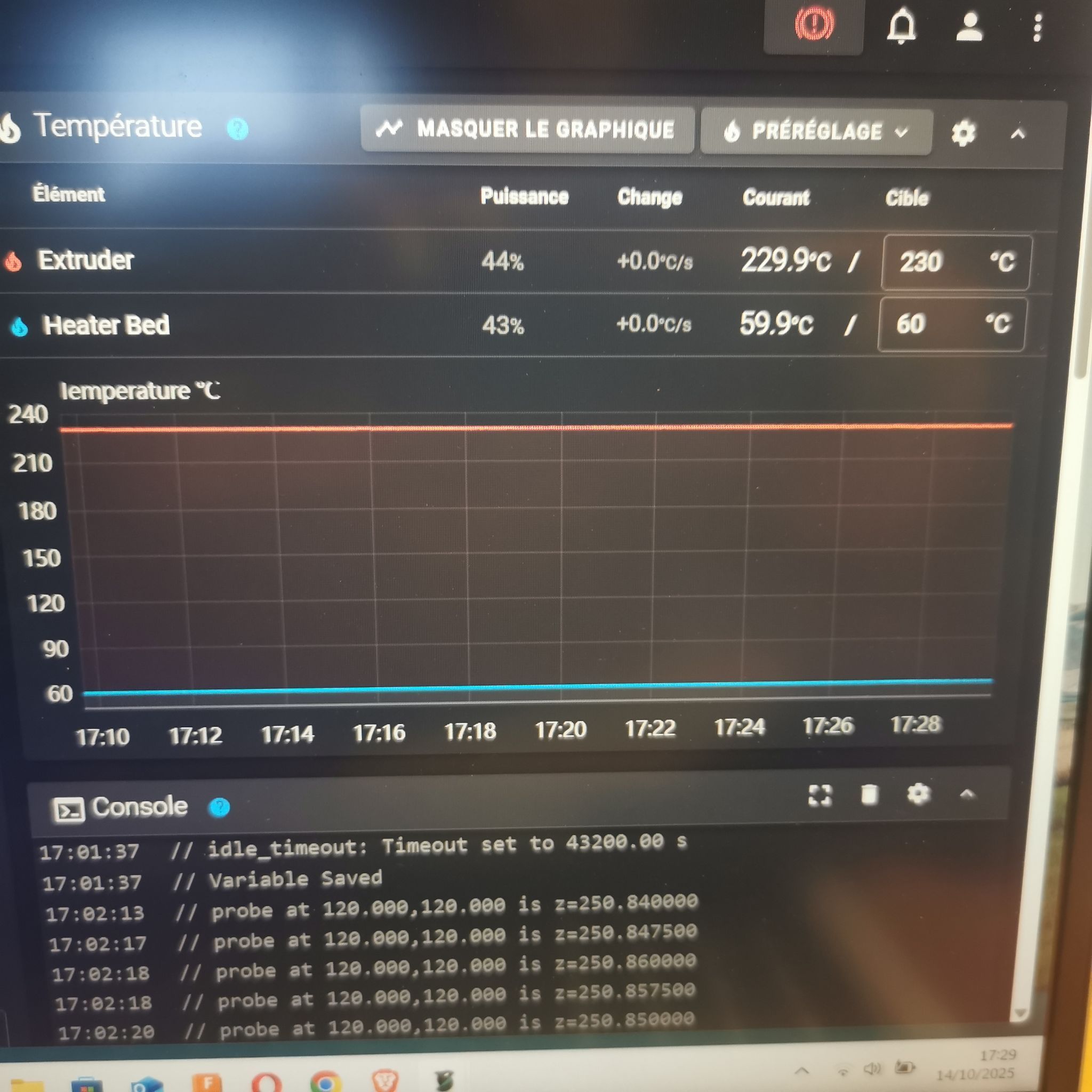 chlem Posté(e) Octobre 9 Posté(e) Octobre 9 Merci pour ta réponse. oui les tempés à froid sont correctes et similaires. Lors du dernier essai de montée à 220°c, la T° est resté bloquée à 200°pendant un moment avant la coupure de klipper. Je persiste avec mes calibration et la machine s'est remise à fonctionner par miracle. Je viens de lancer une pièce de 1h20 pour voir si ça tient. Le plus agaçant c'est d'avoir un fonctionnement erratique car c'est pas facile de trouver la cause. Je te dirai si l'impression à tenu jusqu'au bout. Il y a quand même des sautes de T° étranges.