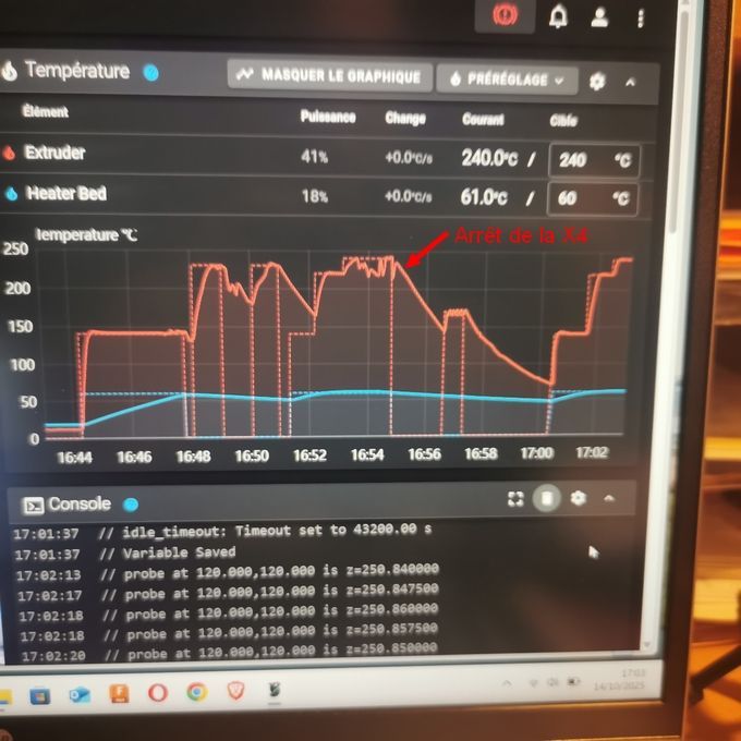chlem Posté(e) Octobre 9 Posté(e) Octobre 9 Bonjour, Hélas, le répit aura été de courte durée, X4 de nouveau en croix. Toujours le même message La calibration PID ne résout plus rien. Impossible de réaliser des test puisque Klipper bloque tout lors de la montée en T°. Est-ce quelqu'un a une idée du problème et comment le résoudre. Merci