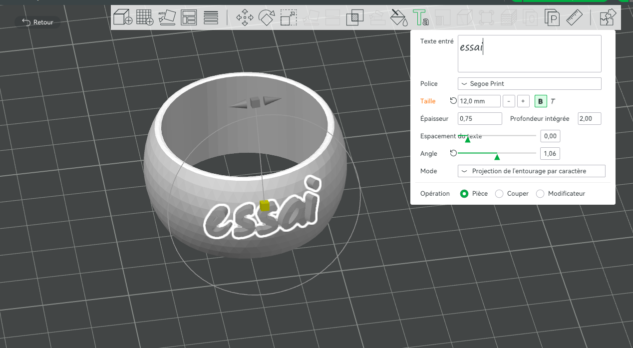 JoOj Posté(e) il y a 55 minutes Posté(e) il y a 55 minutes Bon, beh j'ai téléchargé Bambu studio parce que ce type de traitement est pas supporté par Orca J'ai exactement le même souci que toi, je sais pas trop quelle serait la manoeuvre pour faire autrement MAIS (en attendant que peut être qqun qui maitrise mieux Bambulab te décoince) tu peux le refaire seul. Sur l'objet text shape, plutôt que de le modifier, tu peux le supprimer, puis en refaire un toi même. Une fois supprimé le texte d'origine, sélectionne le rond de serviette. Puis trouve le menu "texte shape" (un grand T avec un petit a) Une fois le texte créé, tu aura un cube jaune, utilise le pour positionne le texte sur ton rond de serviette. Puis enfin, dans la fenêtre de paramétrage du texte, sélectionne le mode "Projection de l'entourage par caractère". Yapluka entrer le texte que tu souhaites, et jouer avec taille et épaisseur pour que ca colle à tes envie.