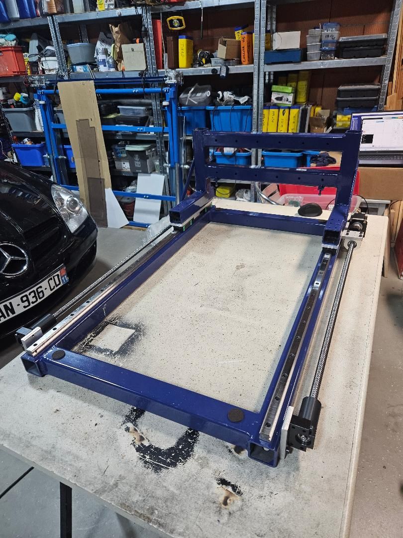 natsamfa31290 Posté(e) Novembre 2 Auteur Posté(e) Novembre 2 Et bien voilà, gros weekend sur ma cnc. Samedi, pointage soudure, redressage et contrôle de la mécano. J'ai pris énormément de précautions tout au long des soudures, je n'ai eu que les deux poutres longitudinales qui se sont cintrées d'un millimètre que j'ai pu redressé avec un cric hydraulique, pas de gauche sur la planéité des appuis des rails. Sur la mécano mobile, j'ai eu un peu de gauche sur la planéité d'appui des patins, avec un peu de calage, tout était OK. J'ai pu donc faire un montage à blanc de la partie Y avec les rails et les vis à billes, j'ai vérifié la course, les butées mécaniques sur les vis. J'ai contrôlé la perpendicularité de l'appui X, à l'équerre ça parait parfait, au niveau numérique 0.2°, je verrai si je cale la table X pour si peu de défaut. J'ai pu faire bouger l'axe Y avec CNCJS, c'est une grosse étape, j'ai du mettre des connecteurs sur les moteurs Y et des câbles blindés jusqu'au contrôleur. Dimanche, contreperçage des plaques supports des vis à billes, pour les futures goupilles. Démontage de toutes les parties mécaniques. Dégraissage et mise en peinture avec un apprêt en bombe. Direction Casto, pour la planche 80*120 cm qui va recevoir la CNC, j'ai prévu quelques insert M8 pour la mise en place de brides de serrage. Découpage des plaques de plexiglas qui serviront à réduire les projections de copeaux. Première couche de peinture et c'est bon pour ce weekend. 4