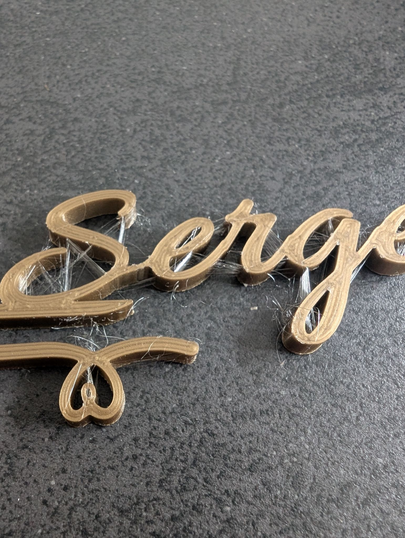 MaxKUB Posté(e) il y a 3 heures Posté(e) il y a 3 heures Bonjour, afin d'embélir le futur mariage avec ma conjointe, nous souhaitons réaliser des marques place prénom à placer sur les verres. Nous dessinons donc sur Solidworks chaque prénom que nous imprimons ensuite. J'aimerais quelques conseils réglages pour arriver à la qualité souhaitée sans post traitement. Commençons par mon set up : - Artillery SW-X4 Pro pas trop utilisée (peut être 5 kg imprimés depuis son achat l'année dernière) - Orca slicer - Fil PLA Amazon basics Gold Mes réglages : - préréglages système - 0.08mm high quality - lissage rectiligne sur la surface supérieure - rapport de débit : 0.98 - pressure advance 0.07 - température d'impression : 195°C - plateau 60°C (texturé) - rétractation : 1,5mm - Hauteur du saut en Z : 0.4mm - vitesse de rétractation : 40mm/s - vitesse de déplacement : 300mm/s - vitesse d'impression : 60 extérieure - 120 intérieur - 150 remplissage J'arrive à ça : Je suis plutôt satisfait de ce résultat mais je n'arrive pas à me débarrasser de ces toiles d'araignée Quelqu'un aurait des conseils svp ? Max