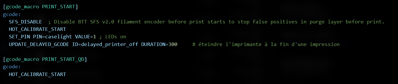 fran6p Posté(e) il y a 20 heures Posté(e) il y a 20 heures (modifié) il y a une heure, pat30 a dit : l'impression se lance, par contre je ne connais pas les répercutions Aucune, tu peux t'en passer. La macro Qidi PRINT_START n'est pas vraiment un code de démarrage d'imprimante. Tu risques juste de ne plus avoir d'éclairage interne (avec mes bandes de LEDs normalement ça éclaire bien . Le Gcode retardé (la dernière ligne de PRINT_START) était utilisé chez moi pour activer la prise connectée permettant d'éteindre l'imprimante. Sans aller jusqu'à la supprimer, tu peux la commenter en mettant en début de ligne un point-virgule (;). Avec Klipper une ligne débutant par un dièse ou un point-virgule est considérée comme un commentaire et donc non évaluée. C'est l'heure de l'apéro donc indisponible jusqu'à demain . D'autres intervenants ont le droit de s'immiscer pour apporter leur eau au moulin. Modifié (le) il y a 20 heures par fran6p