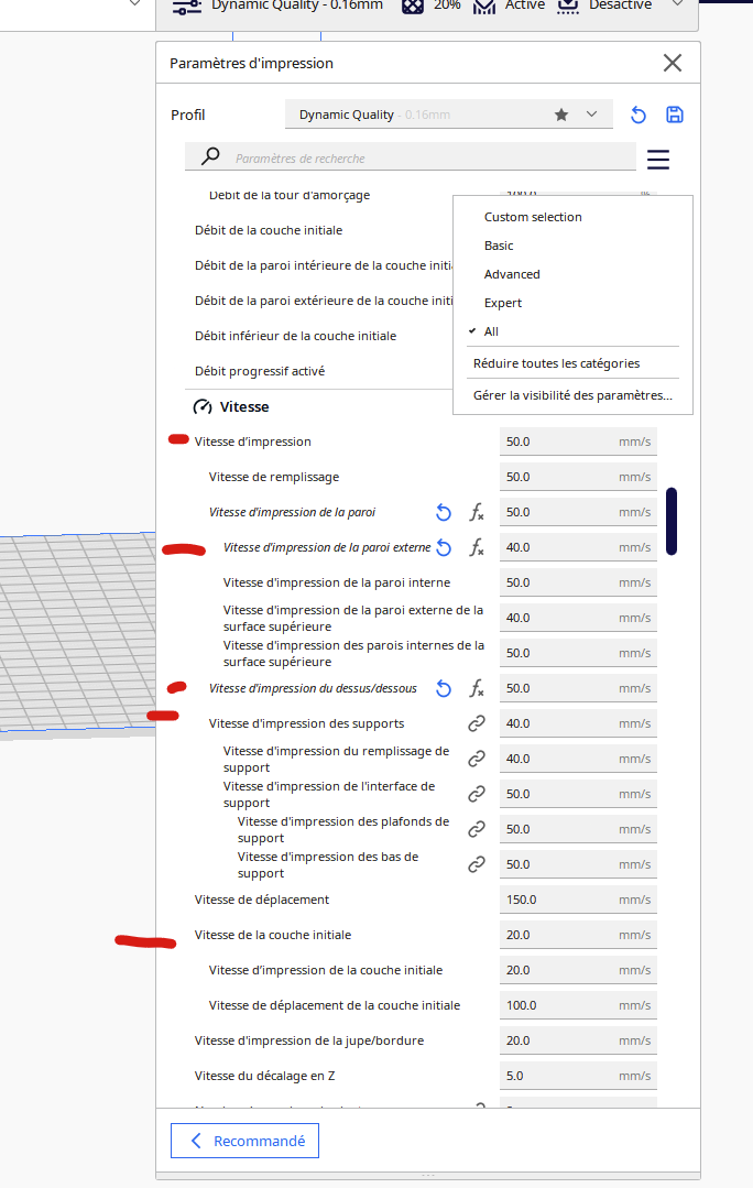 hyoti Posté(e) il y a 3 heures Posté(e) il y a 3 heures il y a 8 minutes, generally a dit : Dans cura ,on met par exemple 60ms et c'est tou C'est selon le mode que tu prends, voici en mode All il y a 9 minutes, generally a dit : Dans orca ,on met la vitesse dans la case " première couche" Pour Orca (comme dans Cura) tu mets une vitesse de première couche plus faible que pour le reste. Voit dans l'exemple de @PPAC ci-dessus