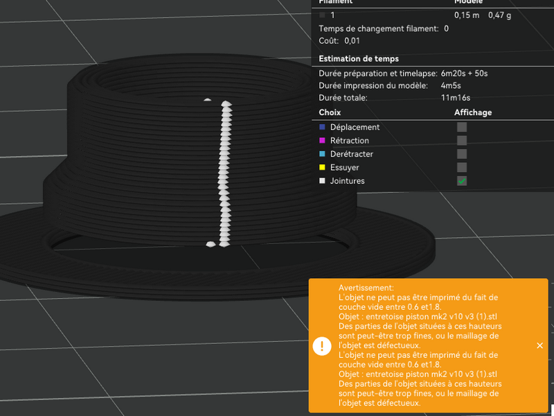 bp006 Posté(e) il y a 7 heures Posté(e) il y a 7 heures Bonjour a tous j'ai fais un petit cylindre avec fusion (environ 20x20x15mm), mais il m'est impossible de le trancher avec Bambu Studio. La piéce sort en 2 partie et le trancheur me propose des supports J'ai une A1 depuis peu et n'avais pas rencontré ce probleme. Avez vous svp une piste pour me depanner? Je peux le trancher avec Cura ... mais je n'ai plus mon Ender 3