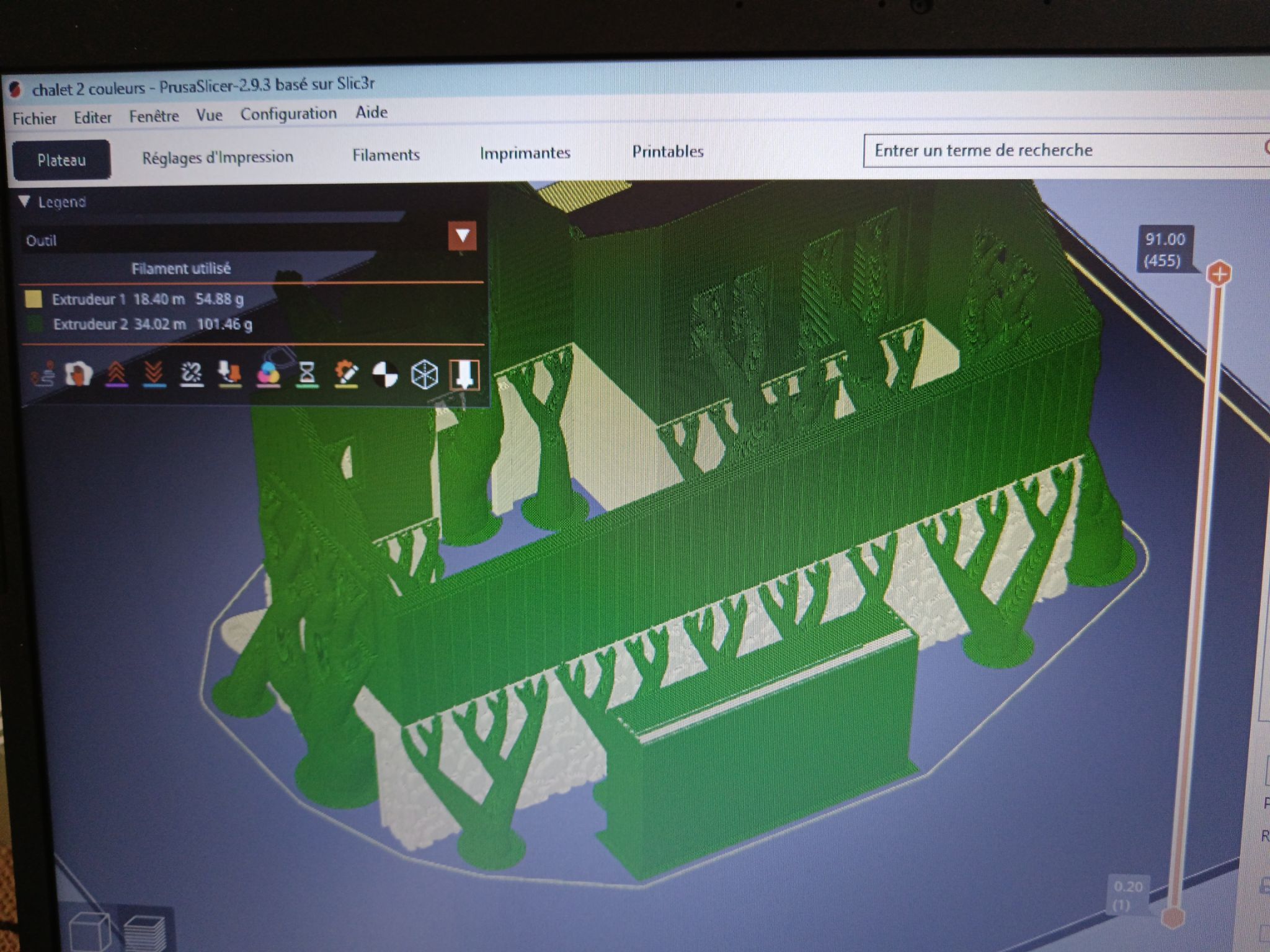 durand cedric Posté(e) il y a 4 heures Posté(e) il y a 4 heures Bonjour la communauté, Je voudrais savoir comment on peut faire pour avoir des supports de même couleur que les pièces que l'on imprime en dual couleur. Je m'explique, comme sur la photo j'avais besoin de support pour le soubassement en gris ( la partie jaune) pareil pour le haut du chalet mais en marron ( la partie verte) Mais impossible de savoir comment faire pour avoir les supports de la même couleur que les parties, prusa slicer m'a fait que les supports en marron ( partie verte). Si quelqu'un peut éclairer ma lanterne ce serait sympa merci d'avance