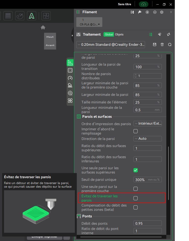 Tiberius Posté(e) il y a 4 heures Posté(e) il y a 4 heures Bonjour tout le monde. Avant tout, je précise que j'ai une Creality Ender 3 V3 KE, potentiellement, c'est possible que ce soit à cause de ça que l'option ne fonctionne pas. Dans Creality Print 6.3.0.3420, en cherchant une option, je suis tombé sur une autre (je me suis pas fait mal, rassurez vous, lol), cette option s'appel "Eviter de traverser les parois" (Je vous met une capture d'écran avec encadrement en rouge pour vous aider à la trouver), mais cette option semble sans le moindre éffet lorsque je l'active, toutes les impressions se comportent exactement comme avant, sauf que je perd un peu de temps d'impression. J'ai coché la case, que j'ai décoché depuis, fait plusieurs impressions avec, mais la SEULE chose que j'ai constaté, c'est une petite perte de temps sur les impressions, mais celles-ci se passaient EXACTEMENT comme avant d'avoir coché la case, ça traverse les pièce sans contourner quoi que ce soit, du coup, je l'ai décochée. Alors que, comme vous le verrez dans la copie d'écran, NORMALEMENT cette option sert à contourner les parois pour éviter "les dépôts sur la surface", mais ce n'est visiblement pas efficace. Je pensais que cette option ferait pareil que "l'anti collision" que je n'arrive plus à trouver et qui existait dans Creality Print 5.0, mais ce n'est pas le cas. Quelqu'un peut m'aider à comprendre cette option ou trouver l'option "Anti collision" de Creality Print 5.0 mais sur la version 6.3 s'il vous plait ? Merci d'avance pour l'aide, et à bientôt.