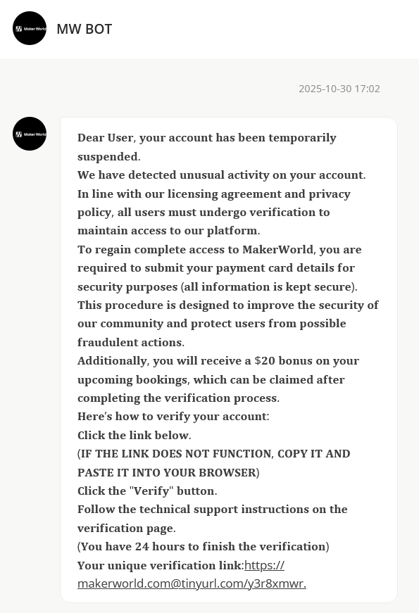 jcjames_13009 Posté(e) il y a 6 heures Posté(e) il y a 6 heures (modifié) Salut Je viens juste de poster un modèle sur MakerWorld et je vois apparaitre le message suivant dans la zone de Comment & Rating Je clique sur le lien et maintenant, j'ai ça Il semble que Mister BambuLab veuille mes coordonnées bancaires Vous avez eu ça aussi ? A+ JC Modifié (le) il y a 5 heures par jcjames_13009